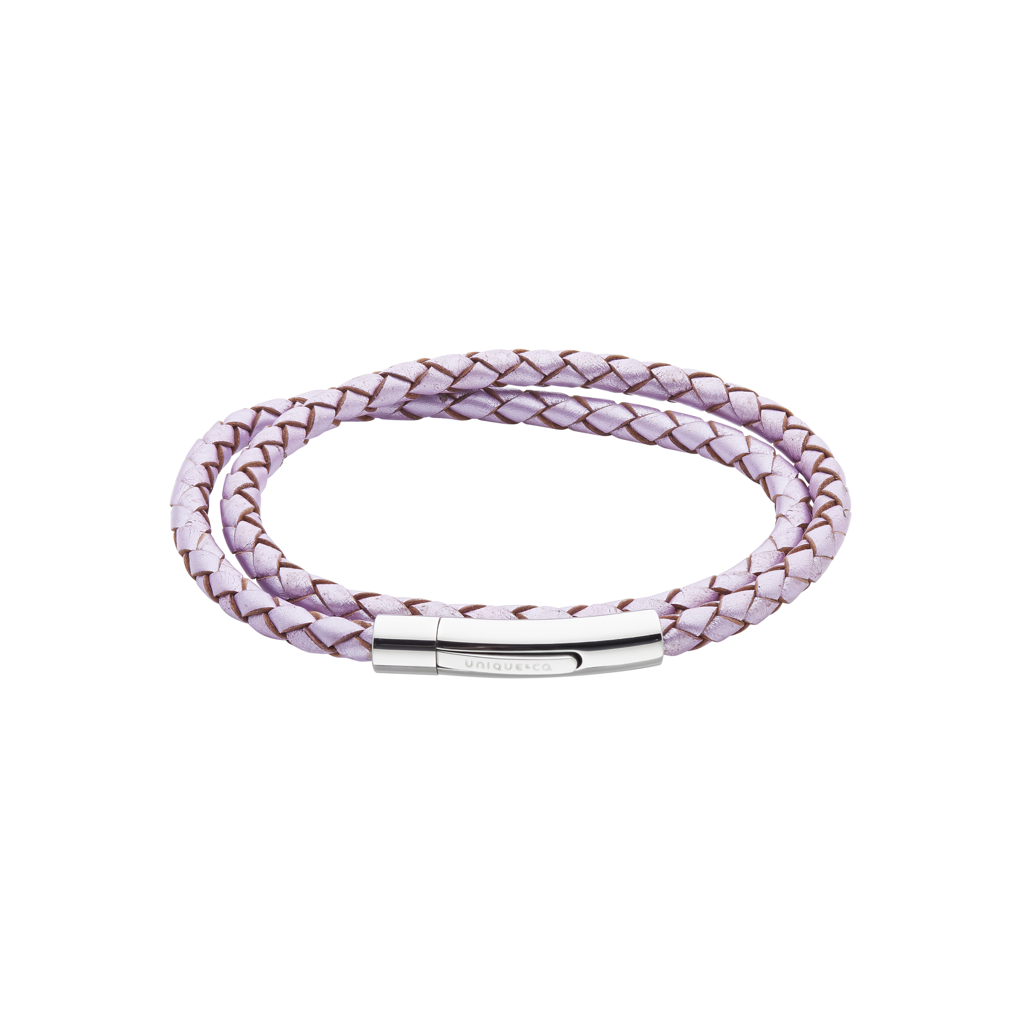 Ladies Unique leather bracelet in metallic lavender with a polished stainless steel clasp.