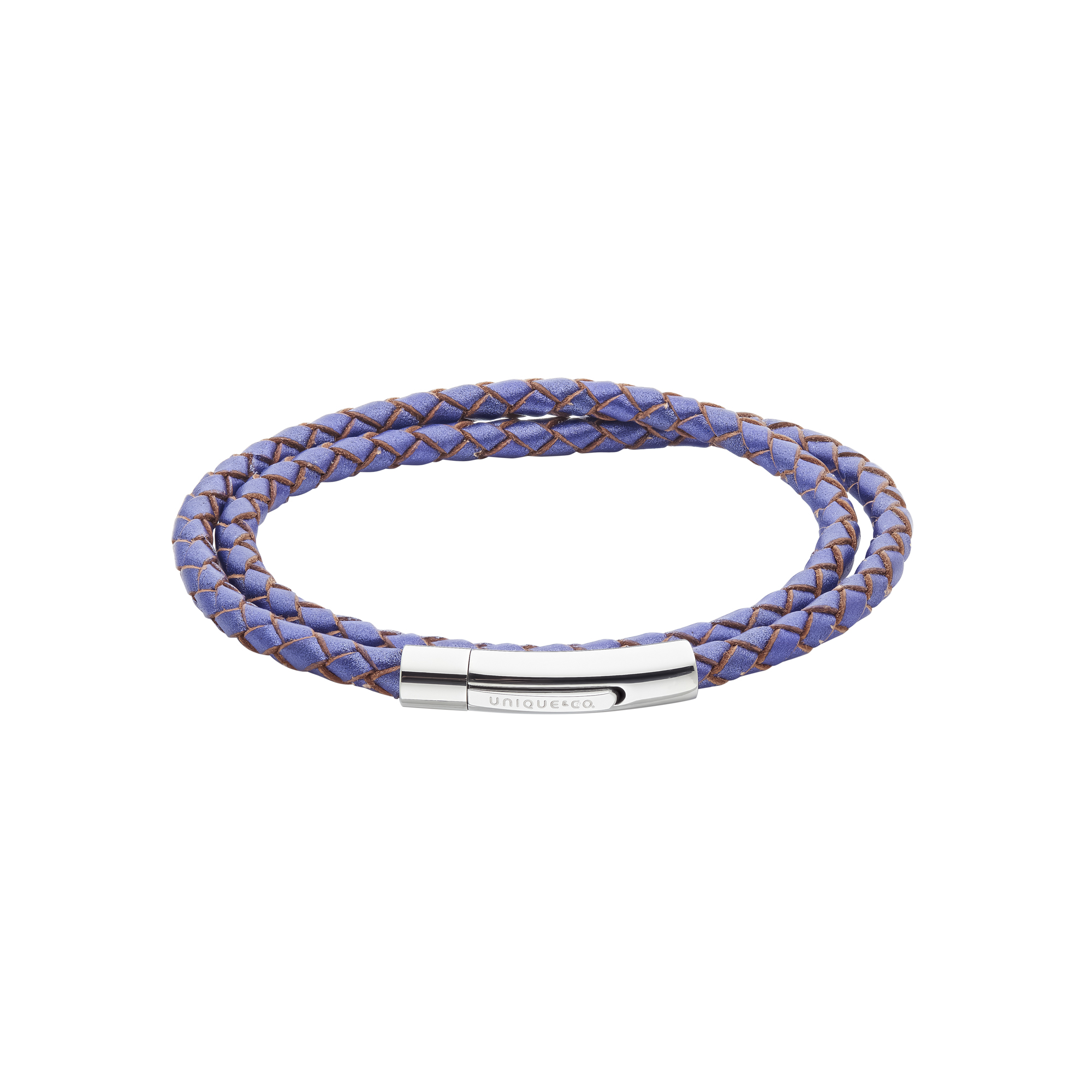 Ladies Unique leather bracelet in metallic purple with a polished stainless steel clasp.