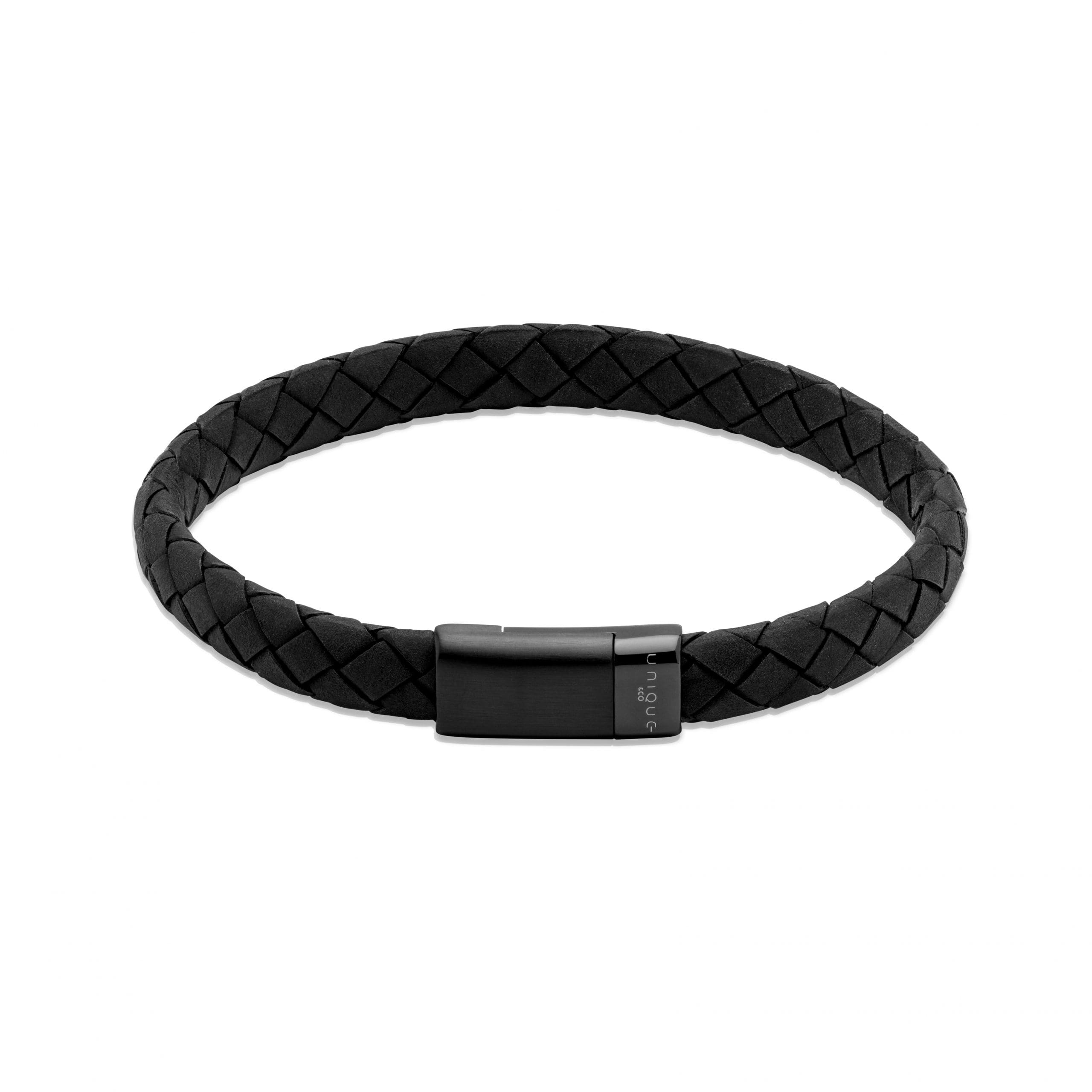 Unique gents woven black leather bracelet with a lift-up black IP plated stainless steel magnetic clasp.
