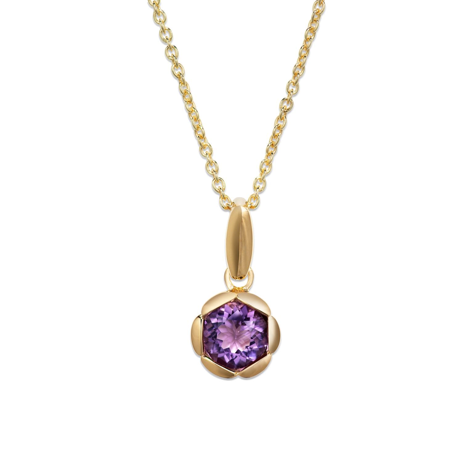 Sparkling round cut amethyst in a modern flower form setting on an adjustable trace chain.