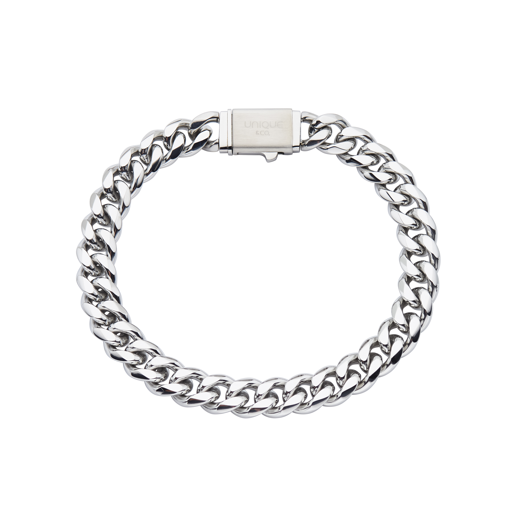 Unique gents rounded curb link chain bracelet with a polished finish and a brushed steel clasp.