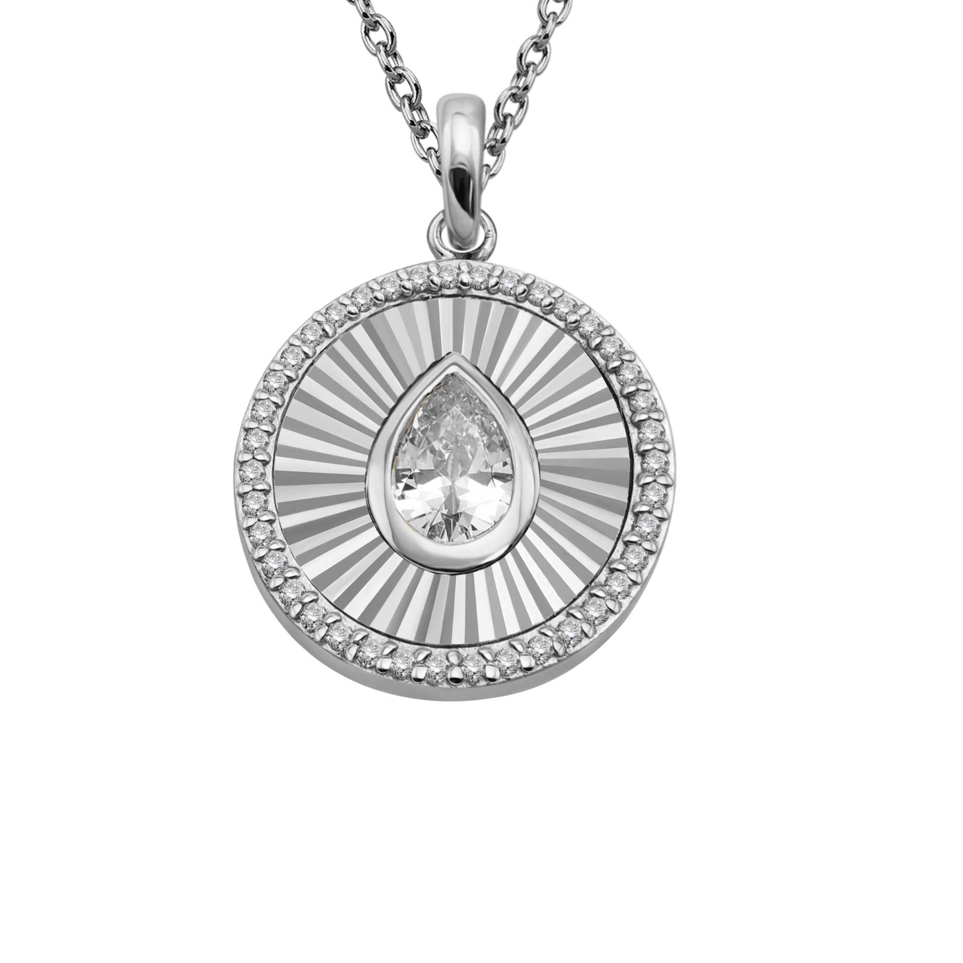 A sparkling pear cut cubic zirconia pendant necklace with bright cutting and cubic zirconia pave. On an adjustable trace chain.