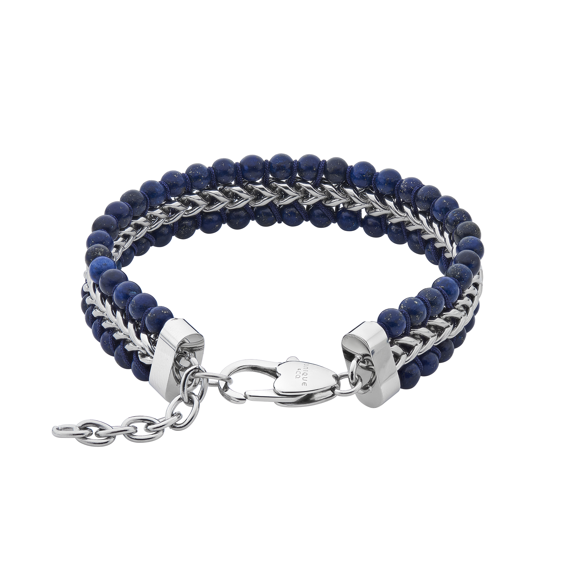 A stainless steel foxtail link bracelet woven with lapis lazuli beads.