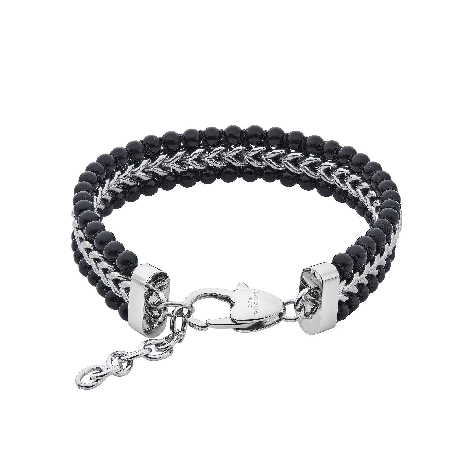 A stainless steel foxtail link bracelet woven with onyx beads.