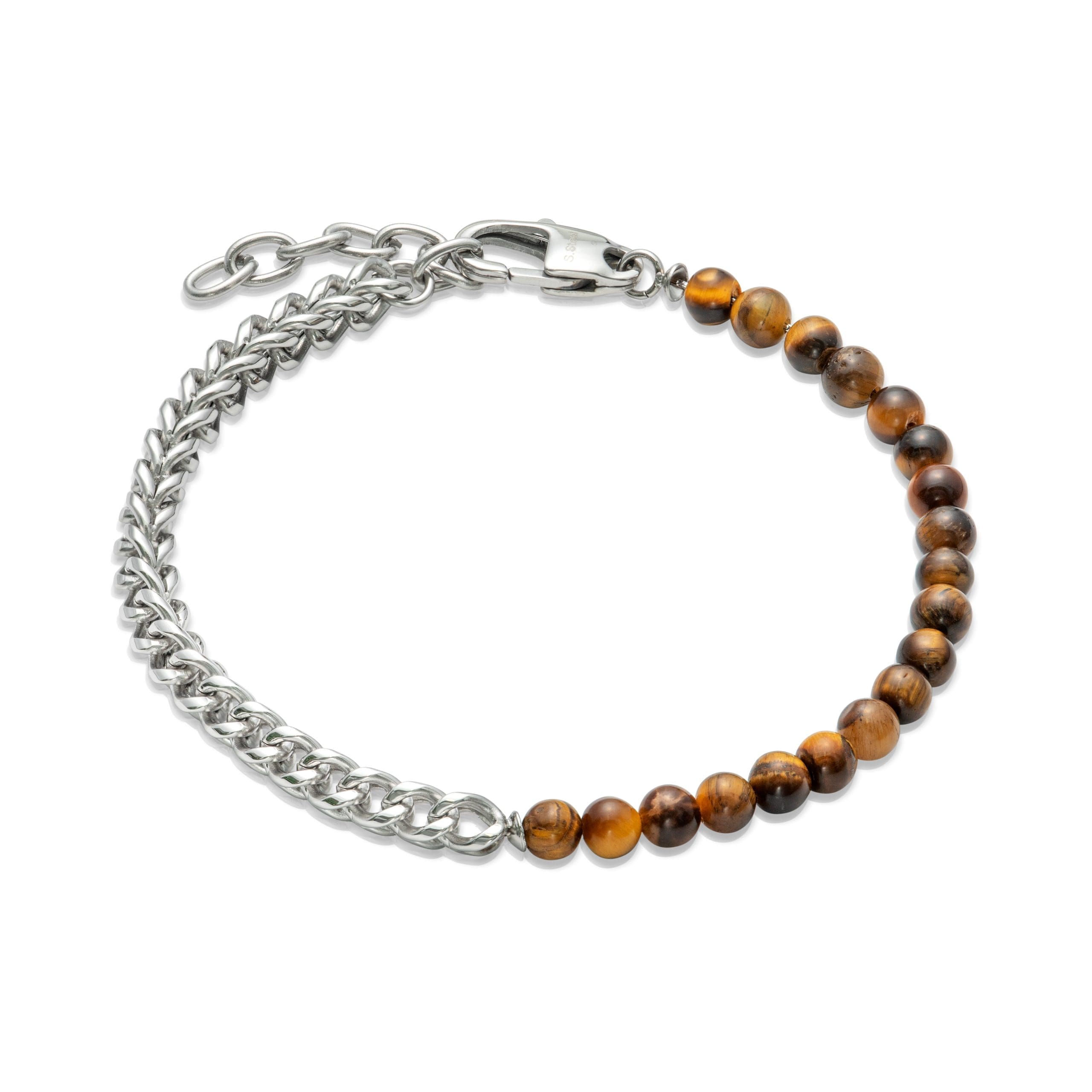 Unique gents bracelet with half tiger’s eye beads and half stainless steel foxtail link chain.