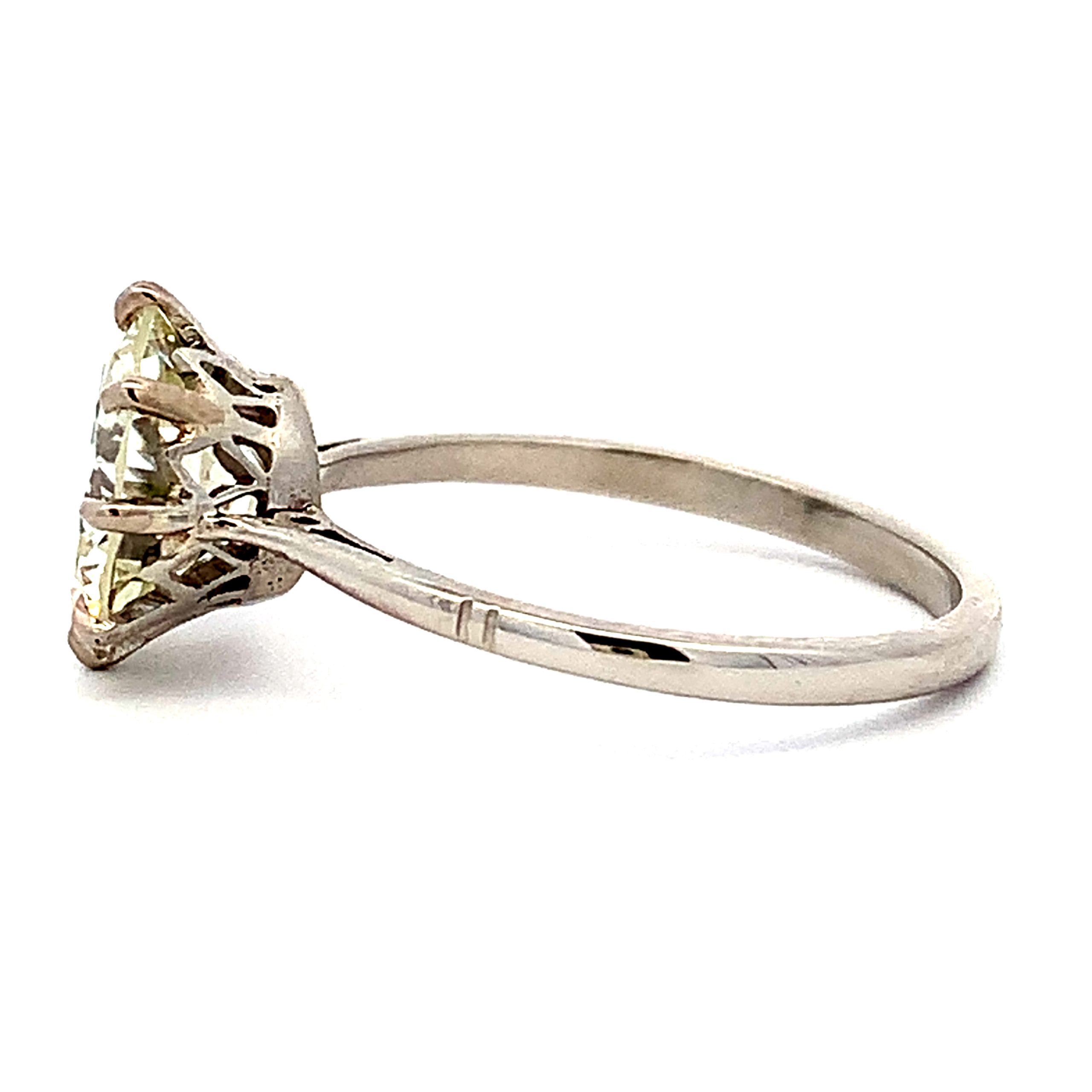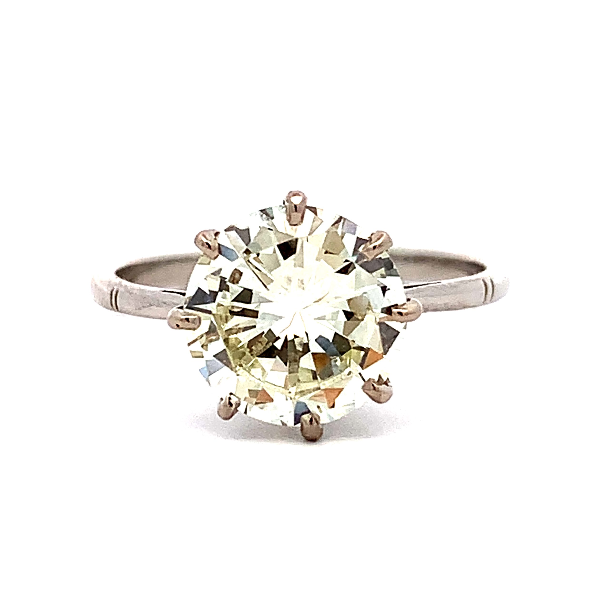 A beautiful vintage platinum solitaire ring with a stunning round brilliant cut diamond in an eight claw setting over a refined ring shank. This diamond has a wider spread and has the appearance of a 2.70 carat diamond.