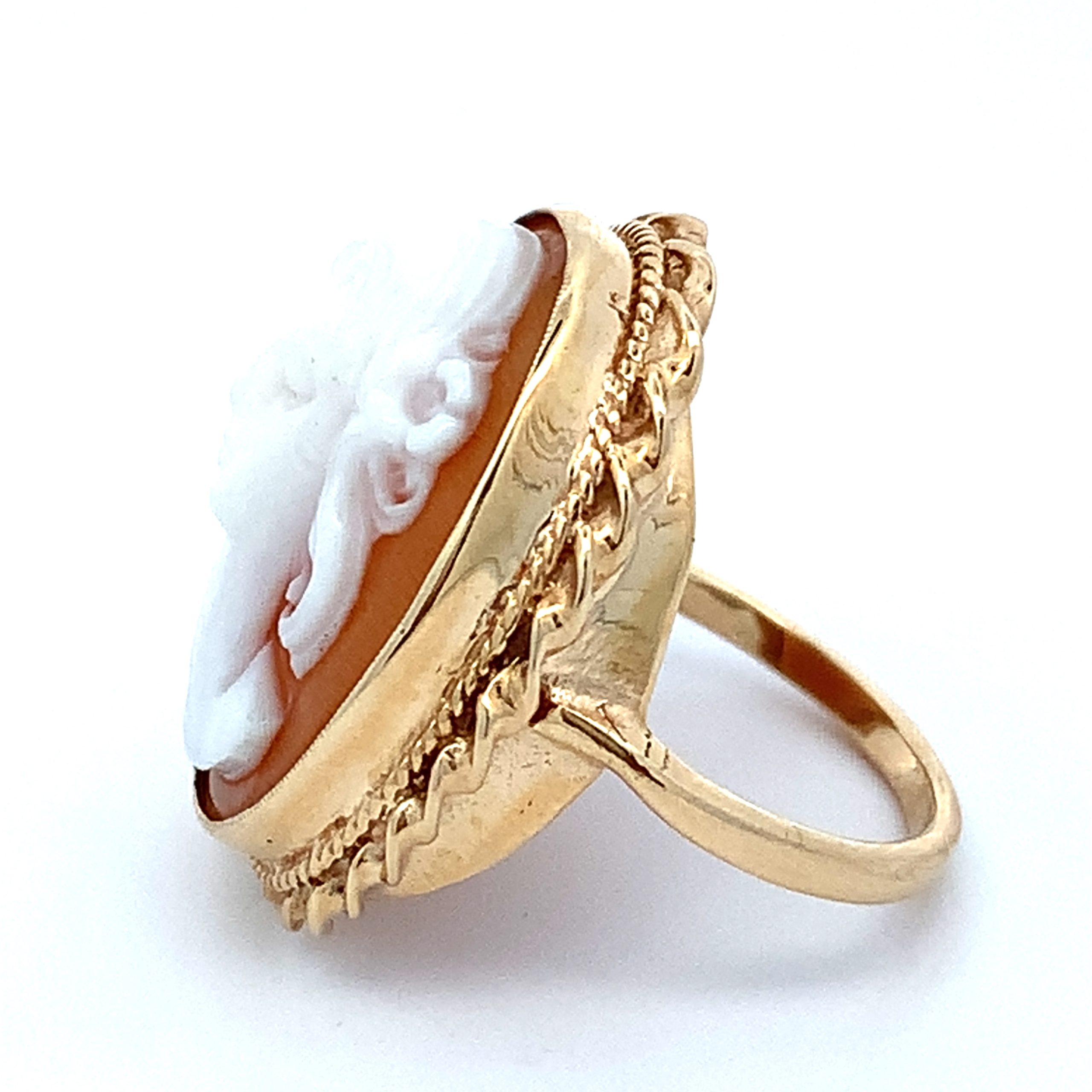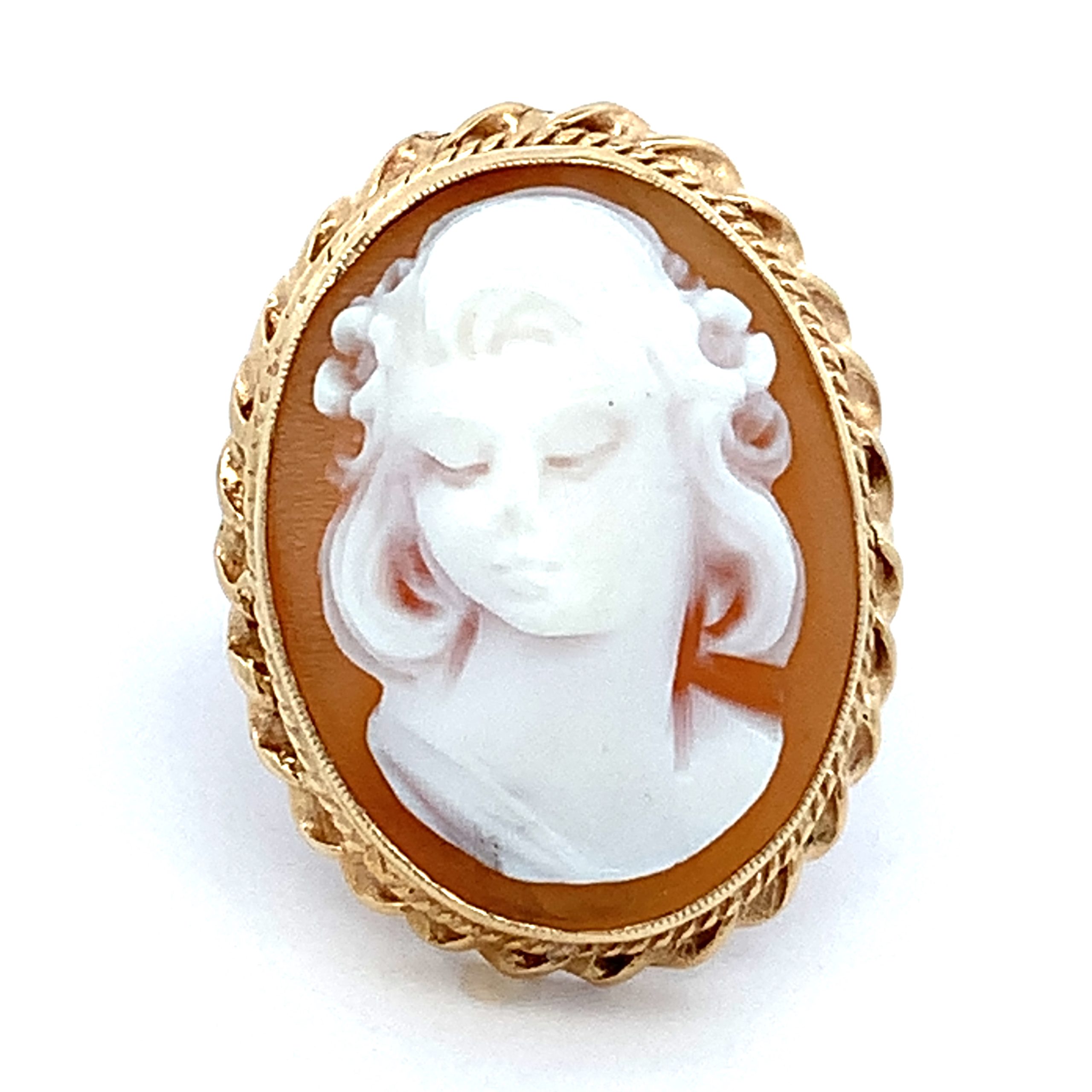 A large oval cameo in a yellow gold handmade wire-twist setting.