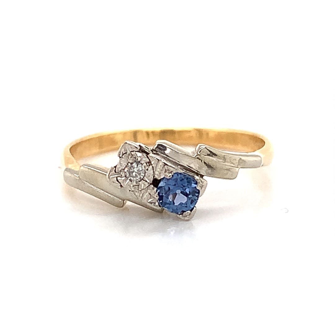 This twist design ring has a deco style platinum top set with a blue sapphire and a small round cut diamond. The shank is in 18 carat yellow gold.