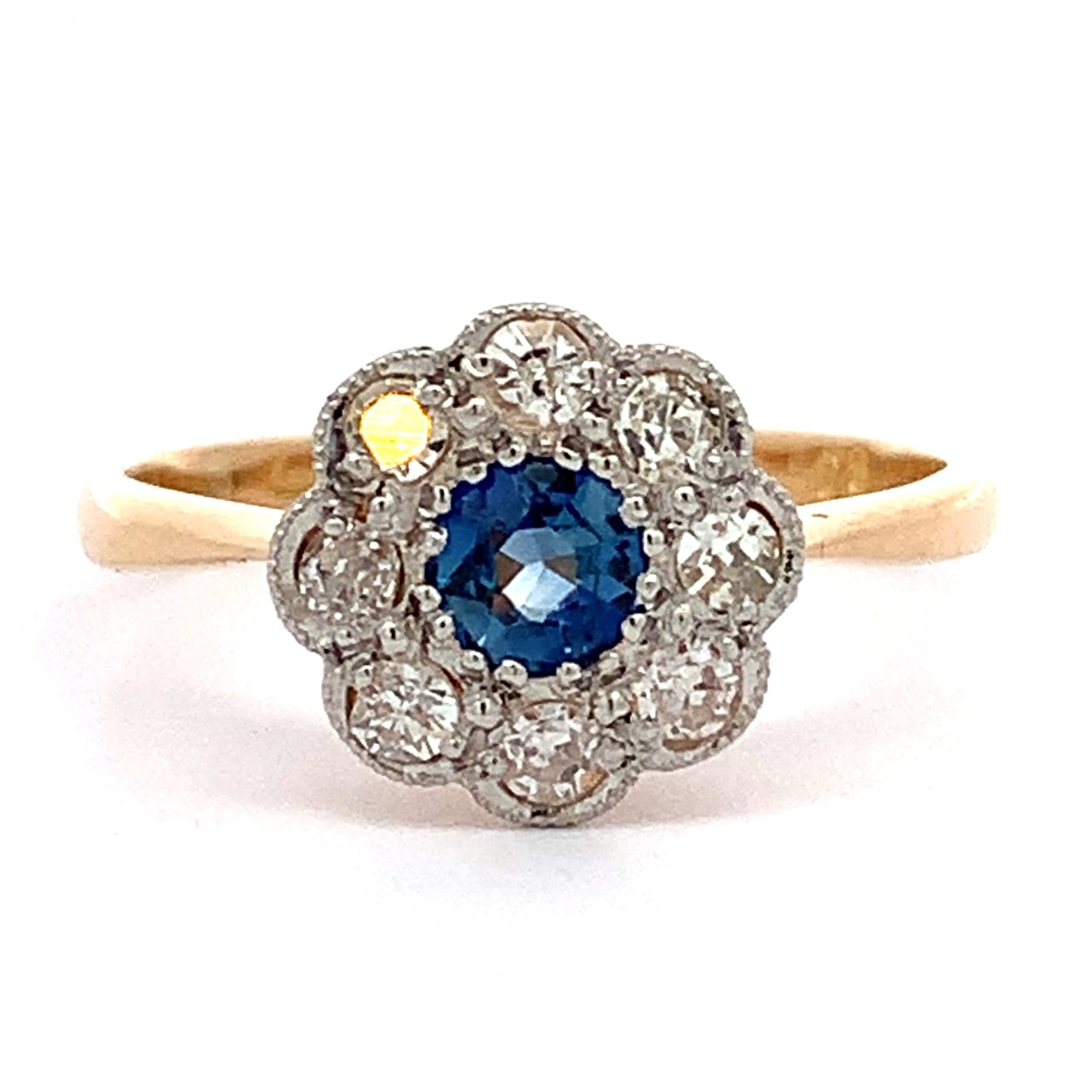 A gorgeous sparkling daisy cluster ring set with round cut blue sapphire and round old cut diamond. Made in yellow gold with a platinum milgrain edge setting. In excellent condition.