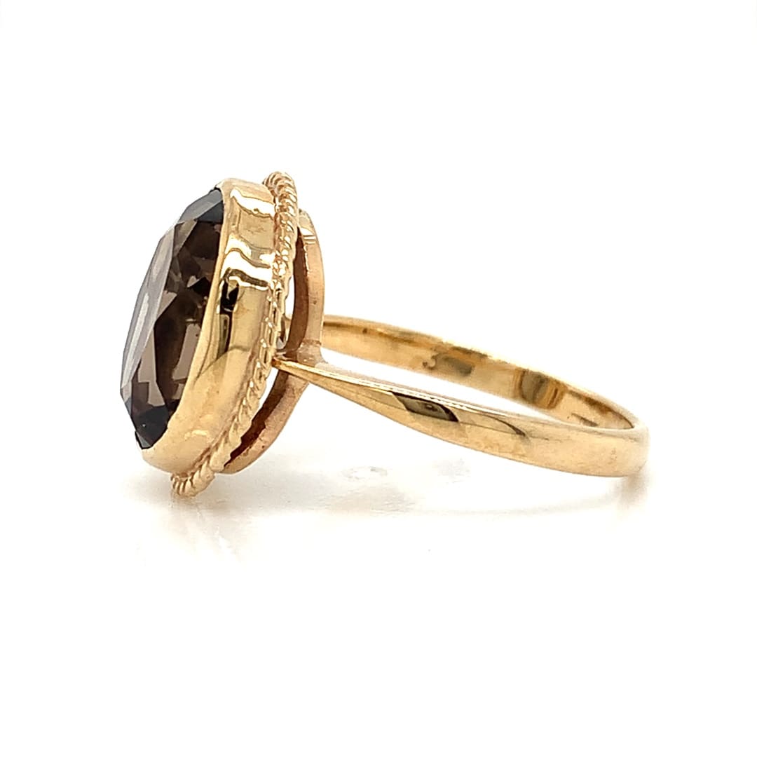 A pretty oval smoky quartz in a traditional design ring with a rub-over setting with twisted wire frame.