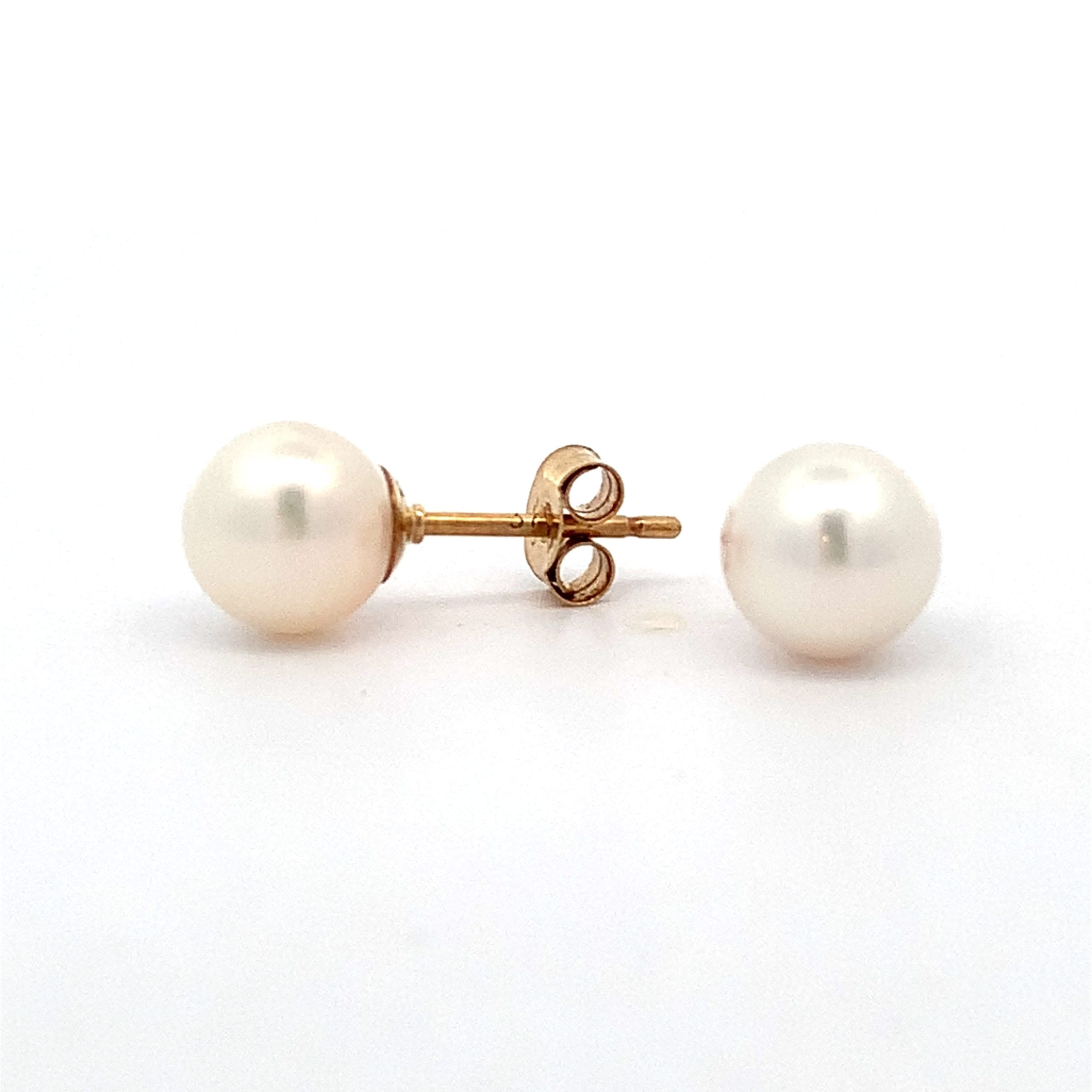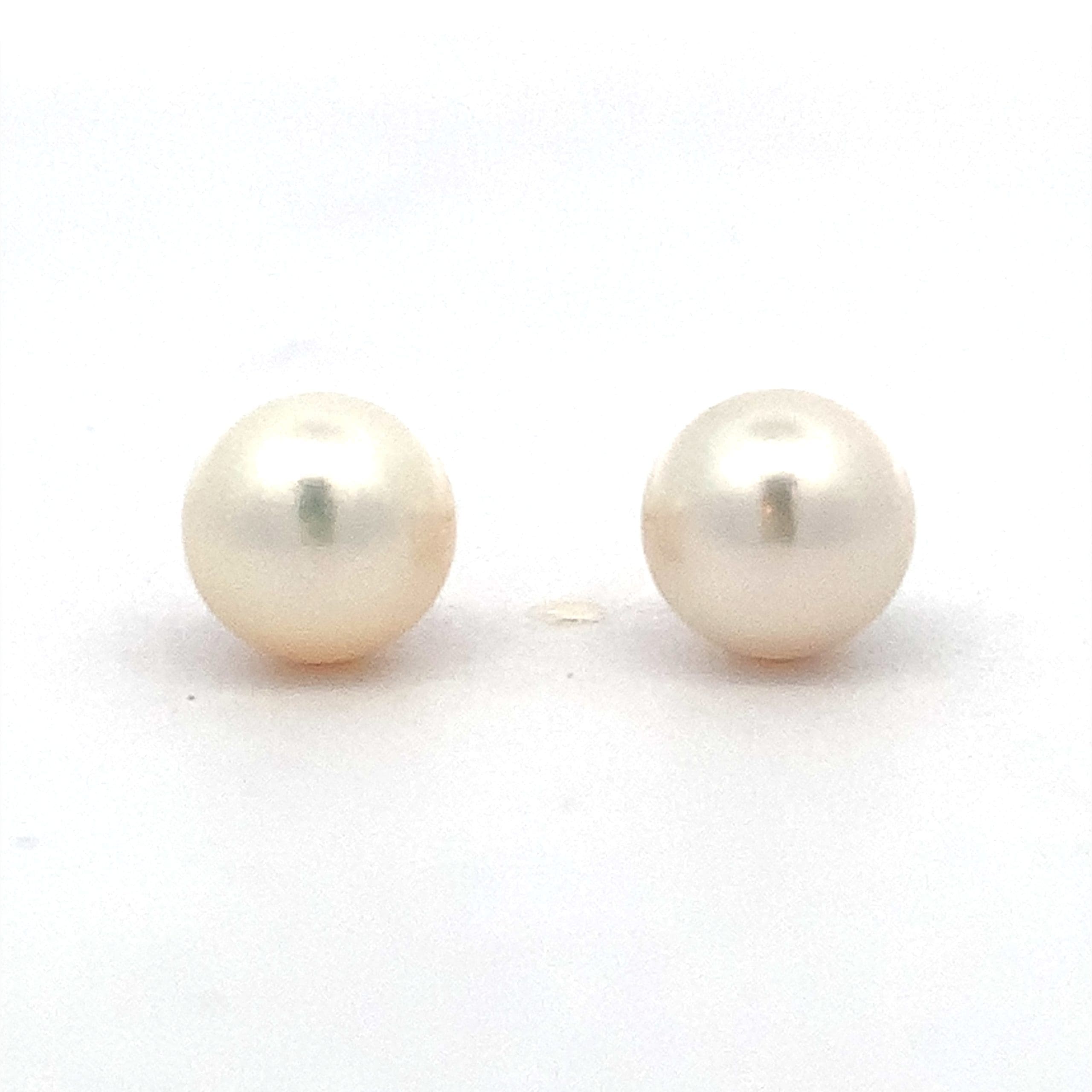 Beautiful white freshwater pearls on 9 carat yellow gold studs with scroll backs.