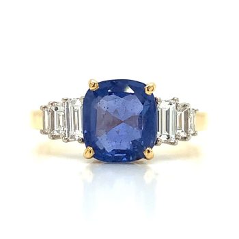 A striking Art Deco inspired ring with a beautiful oval Ceylon Blue Sapphire at its centre in a four claw setting. Each shoulder of this 18 Carat white gold ring is rub over set with three generous princess cut Diamonds.