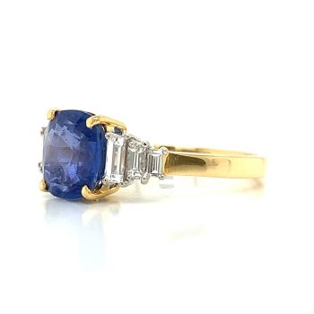 A striking Art Deco inspired ring with a beautiful oval Ceylon Blue Sapphire at its centre in a four claw setting. Each shoulder of this 18 Carat white gold ring is rub over set with three generous princess cut Diamonds.