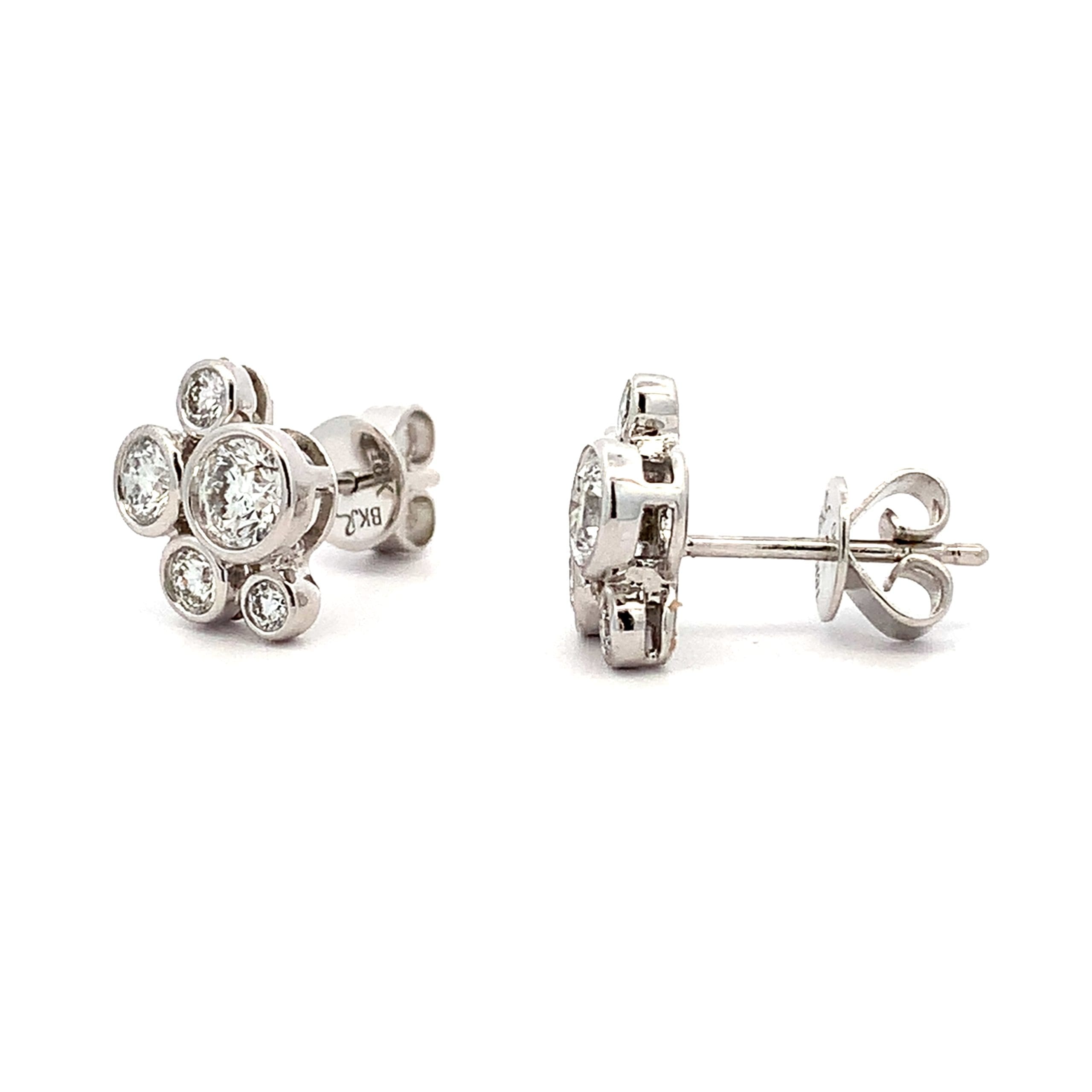 Pretty ‘bubble’ style cluster stud earrings each rub-over set with five round brilliant cut diamonds.