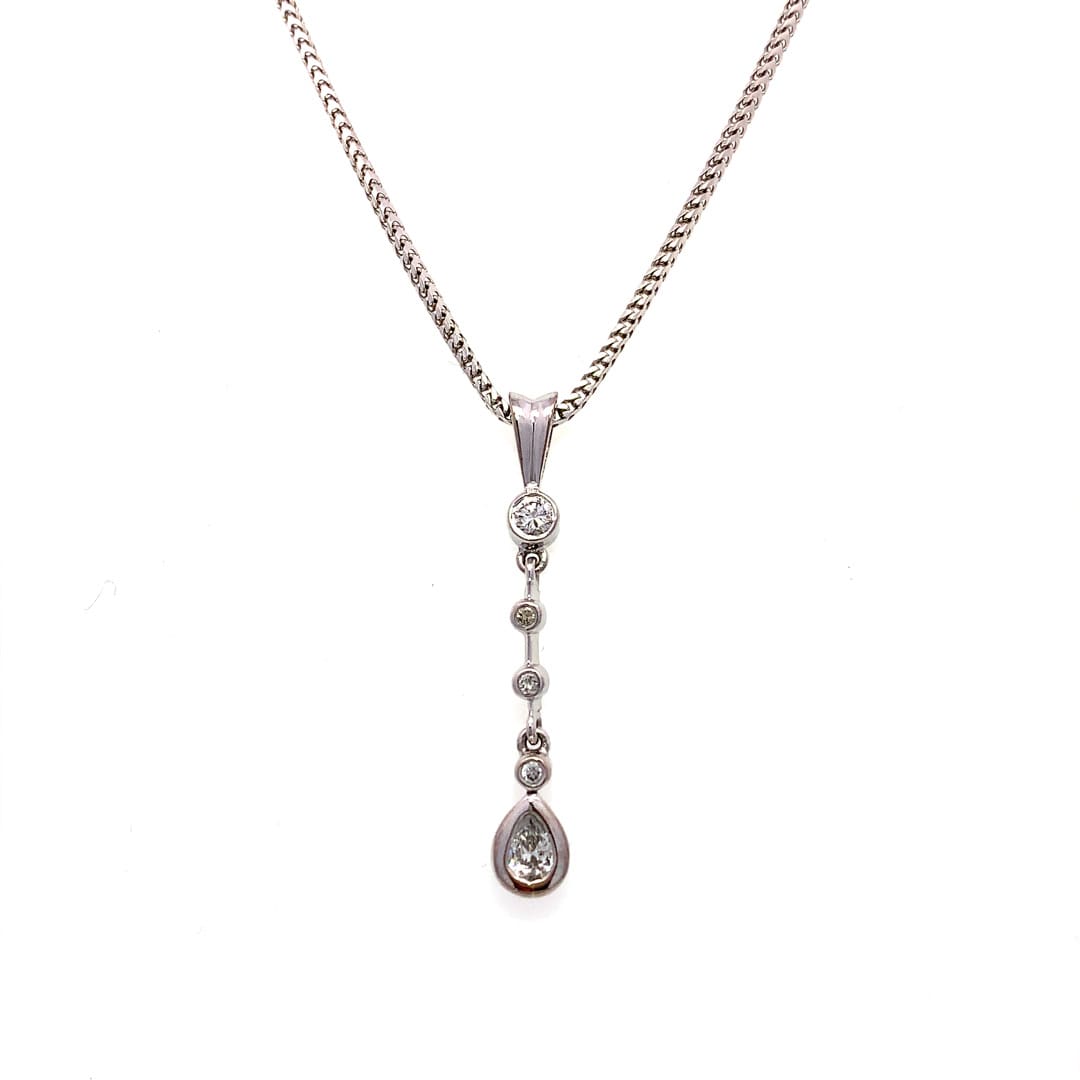 An elegant articulated white gold diamond pendant, all rub-over set with four round brilliant cut and a pear cut diamond.  With a smooth franco chain.