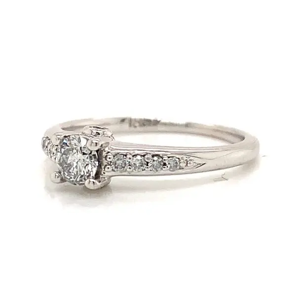 A modern solitaire ring with a central brilliant cut diamond in a four claw setting. Made with pave set shoulders and a small diamond set on either side of the undersetting.