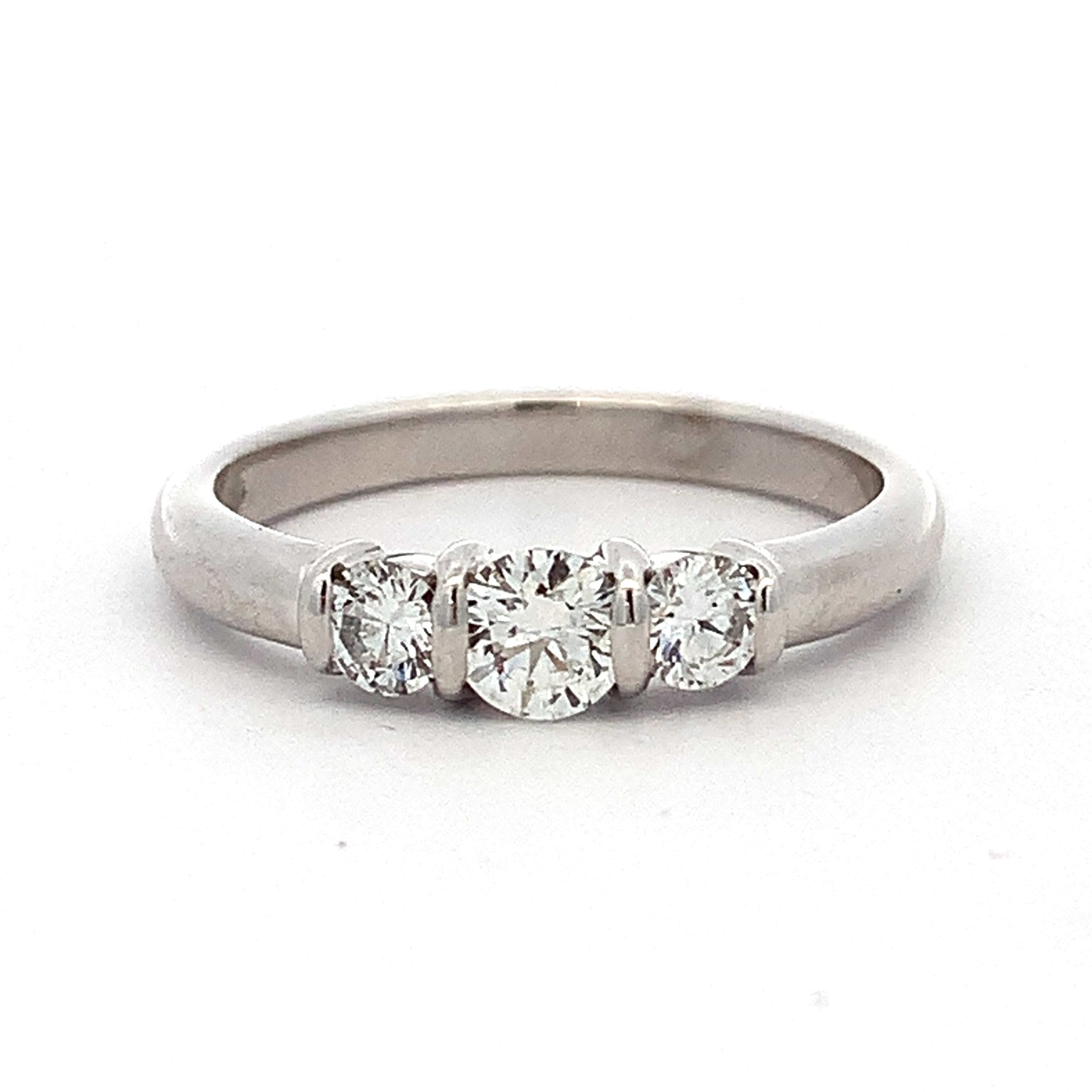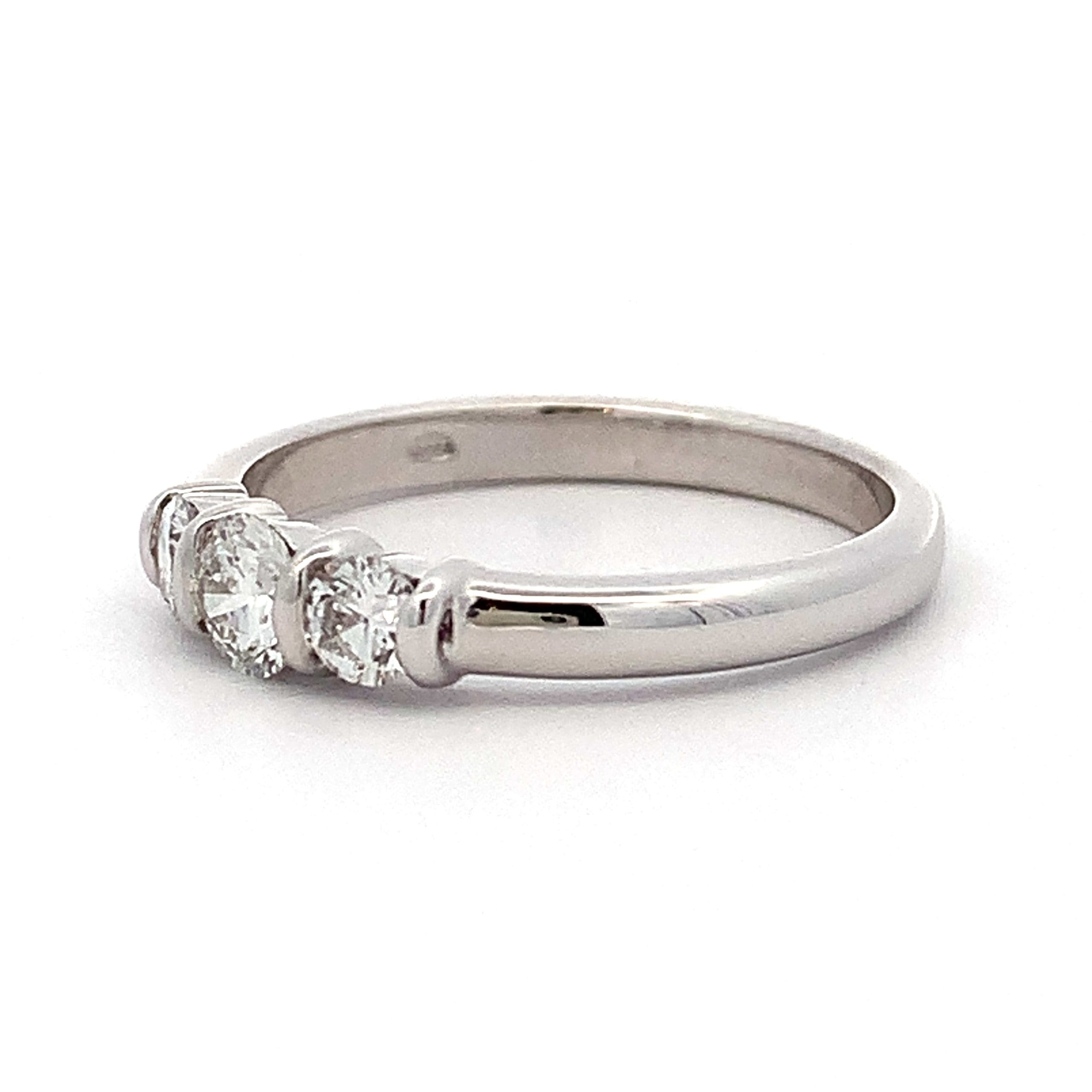 A strong band style ring, bar set with three round brilliant cut diamonds of good colour and clarity.