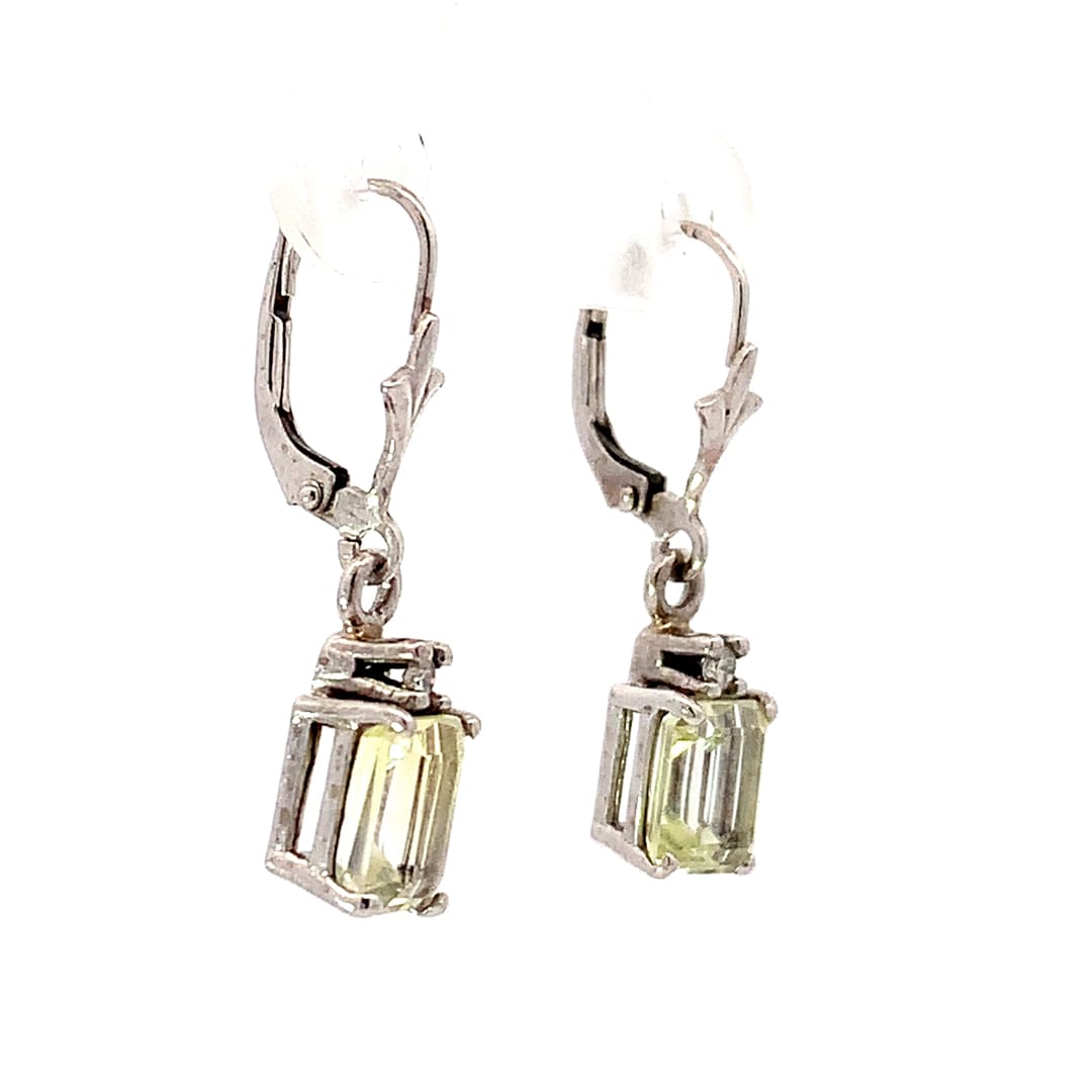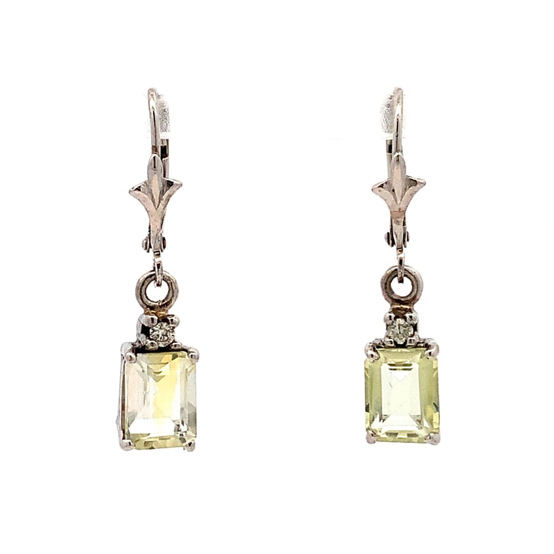 Dainty drop earrings, claw set with step cut lemon quartz and small accent diamonds. Made with continental style fittings.