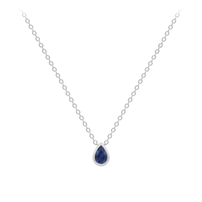 A pretty white gold pendant rub-over set with pear cut blue sapphire on a fine trace chain.