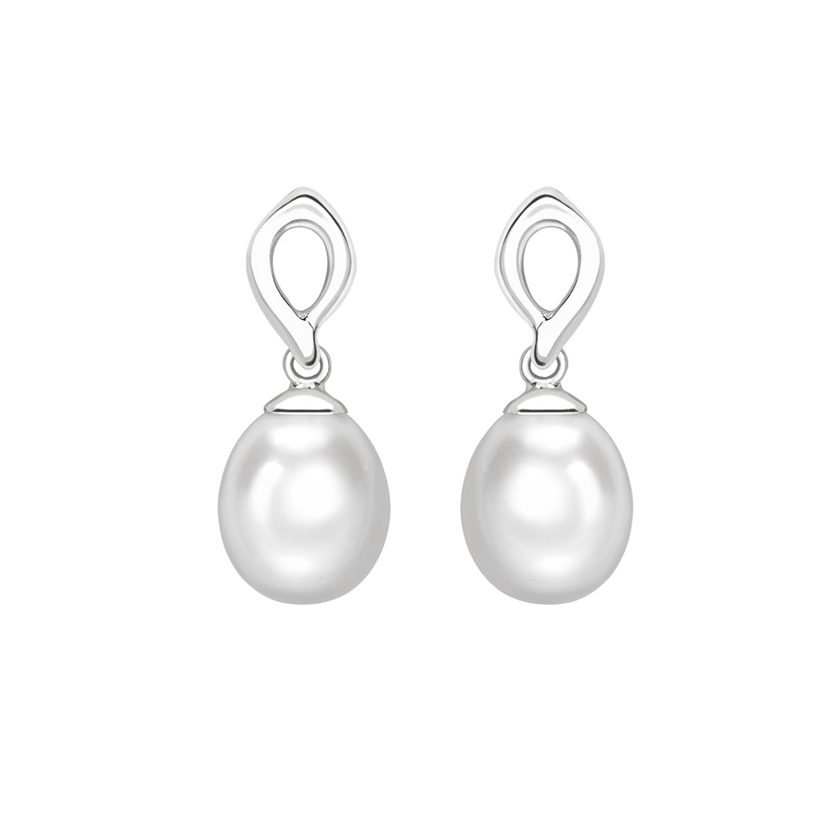 Modern drop earrings with oval, high lustre white cultured pearls and white gold fittings.