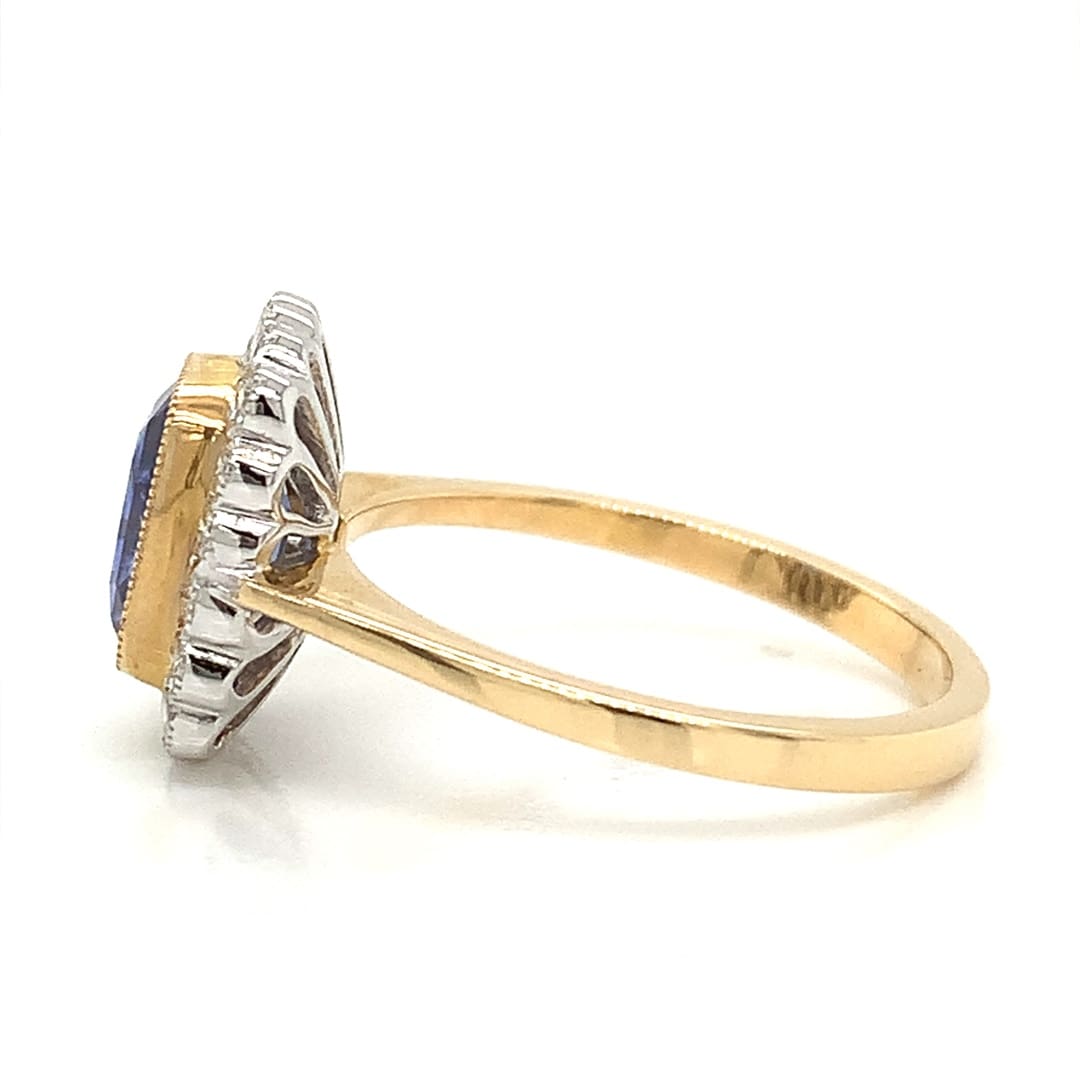 A low set cushion cut Ceylon Blue Sapphire and eighteen surrounding brilliant cut Diamonds, all in a millegrain edged rub over setting.