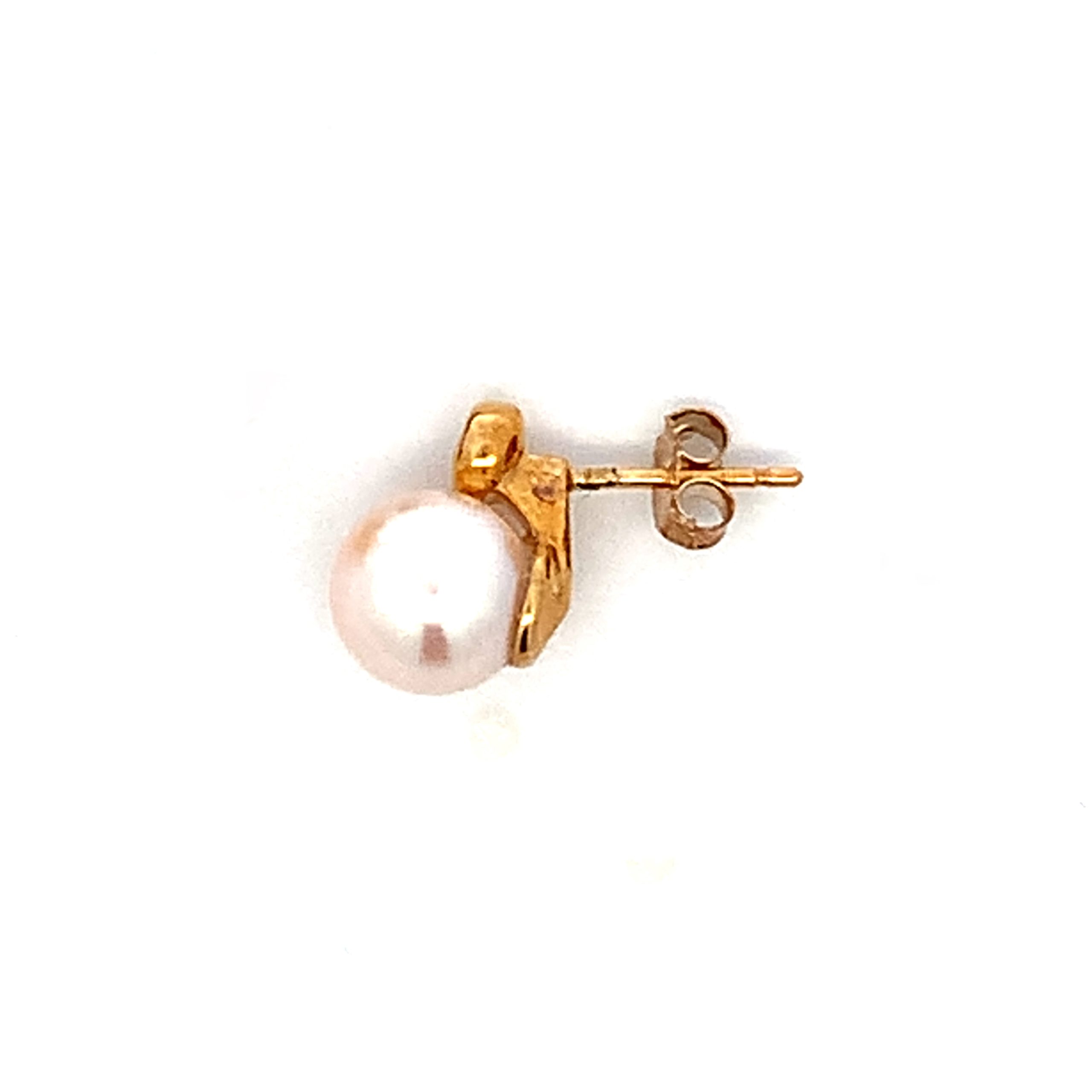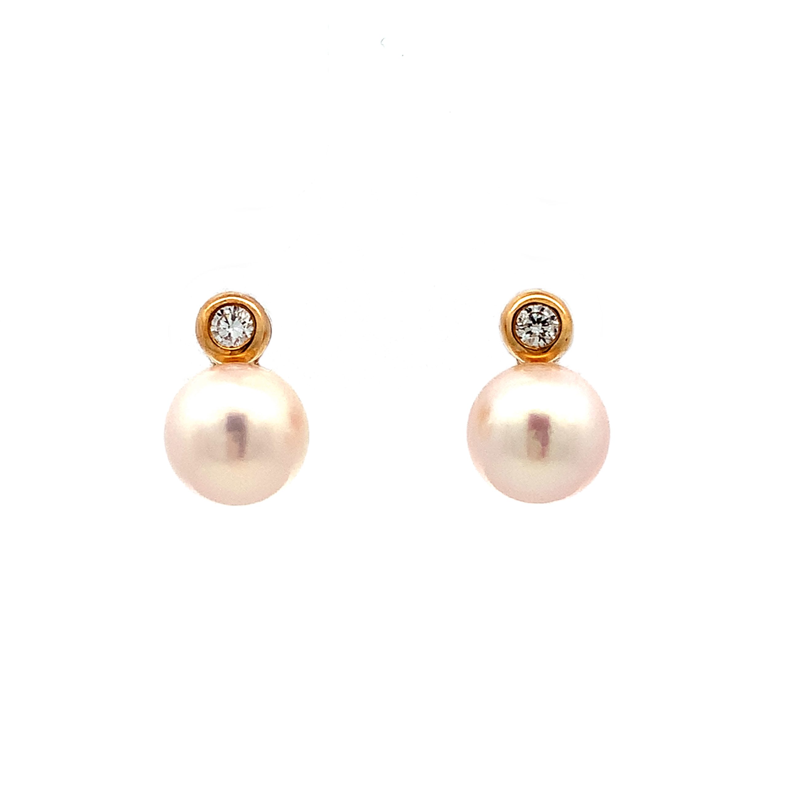 Classic stud earrings with rub-over set round brilliant cut diamonds above high lustre warm tone cultured pearls.