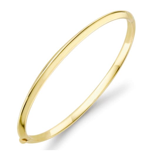 A ladies yellow gold triangular section bangle with a hinge and box clasp closure.