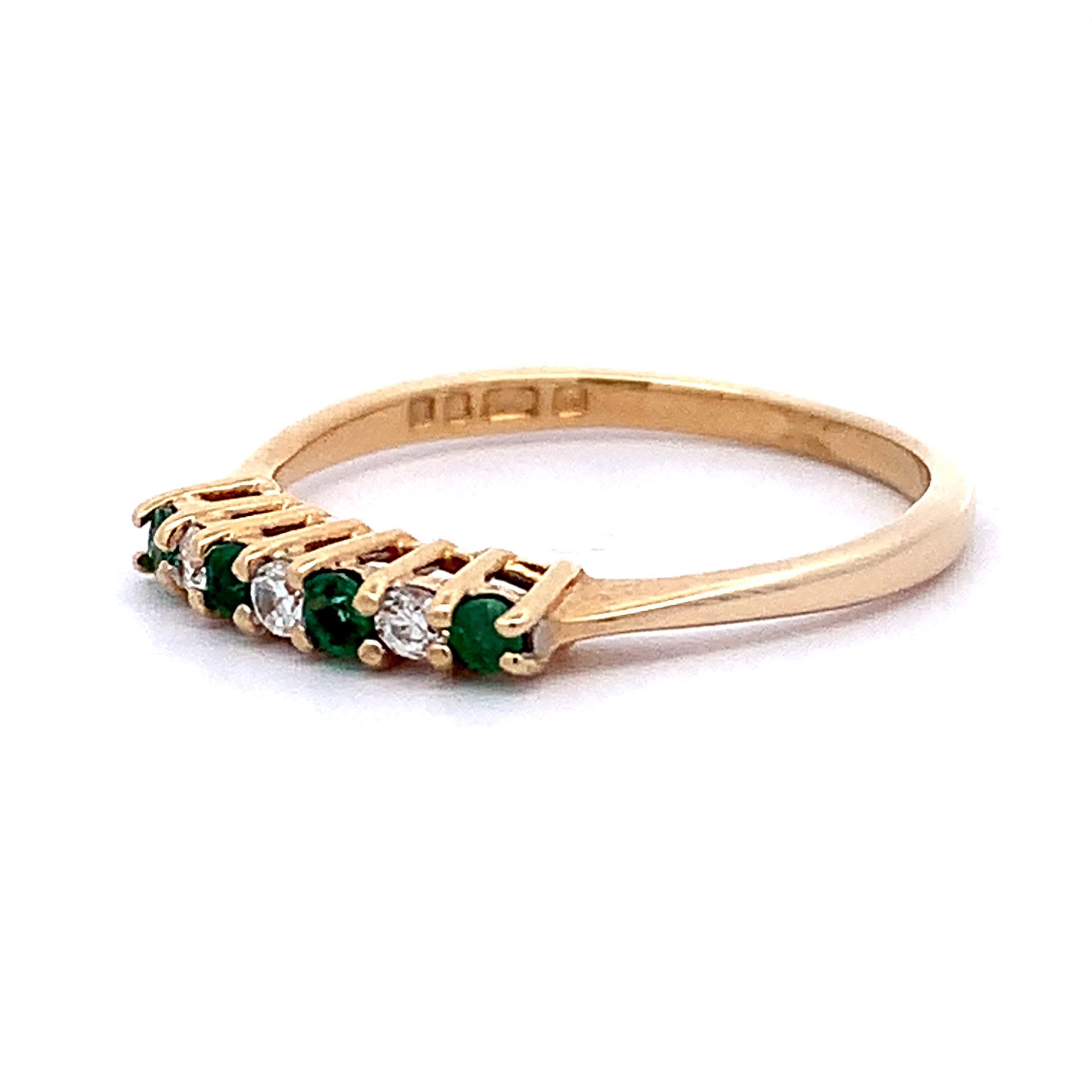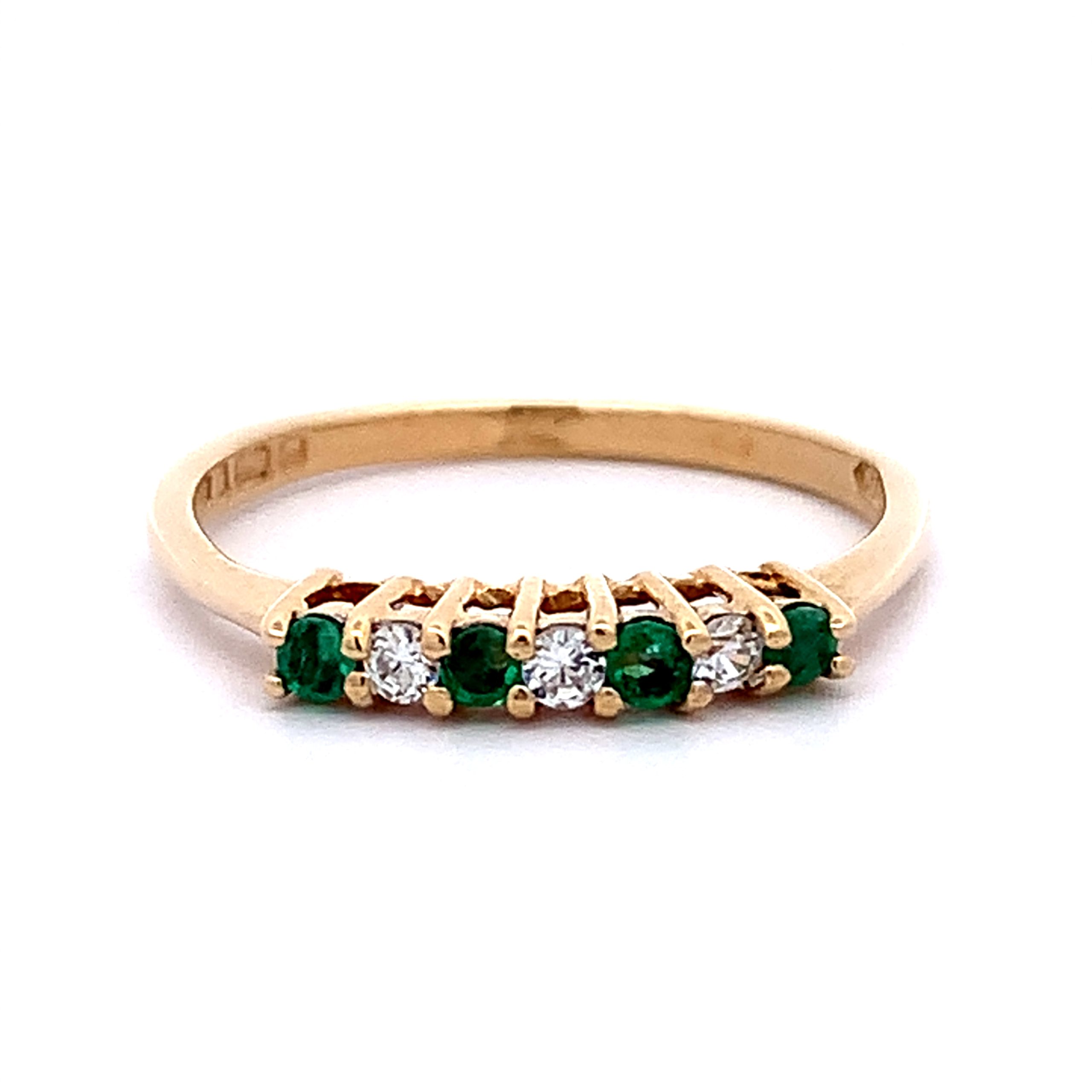 This eternity style ring is claw set with alternated round cut emerald and diamond. Made with a tall setting.
