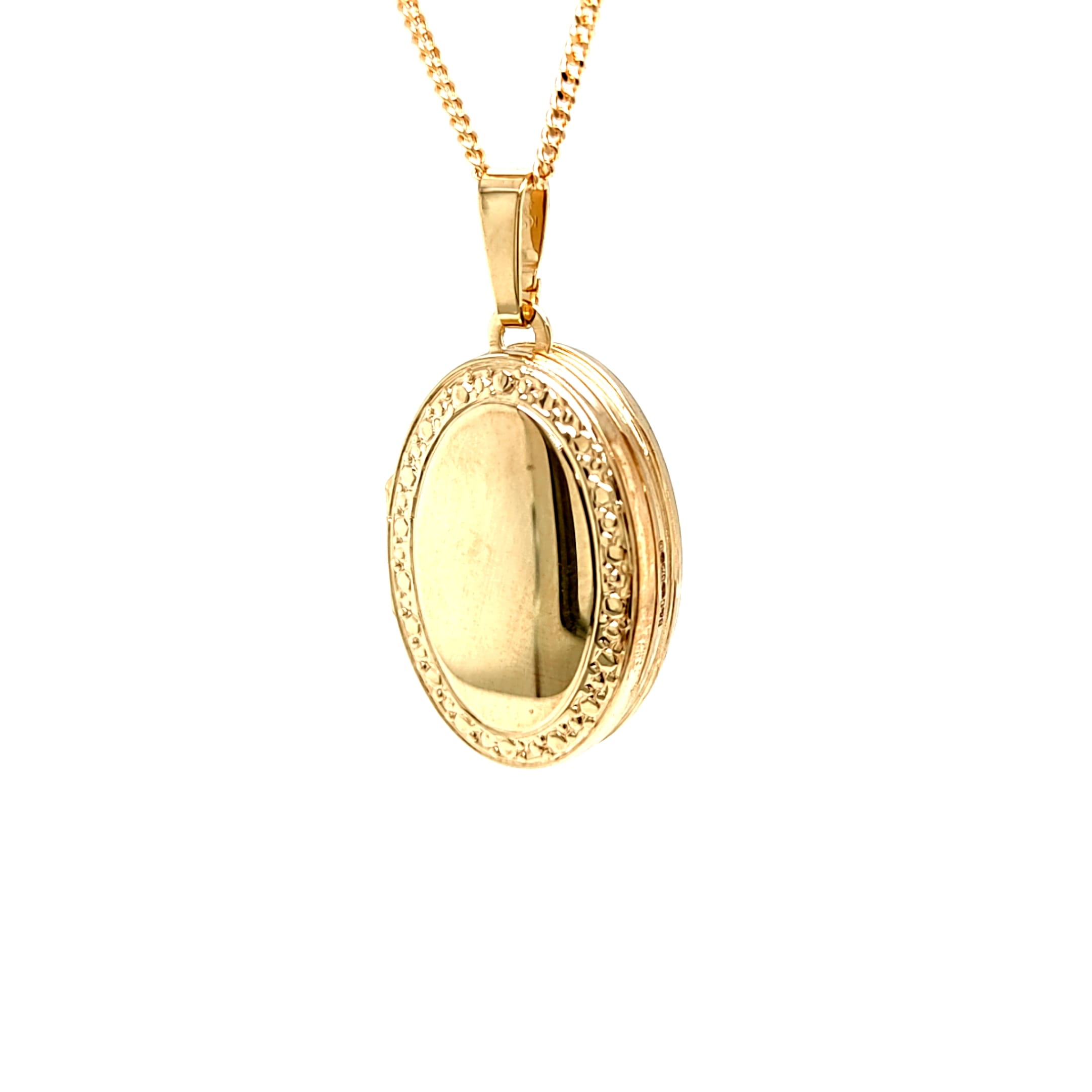 This is a classic mid sized traditional locket with a simple engraved motif to the front of the locket. This locket fits four photos.