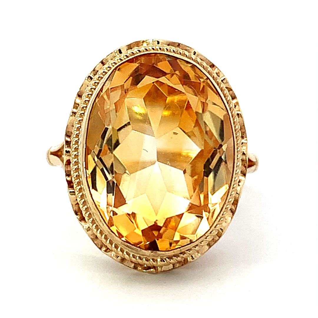 A stunning oval faceted citrine in a traditional rub-over  setting with wire frame decoration.