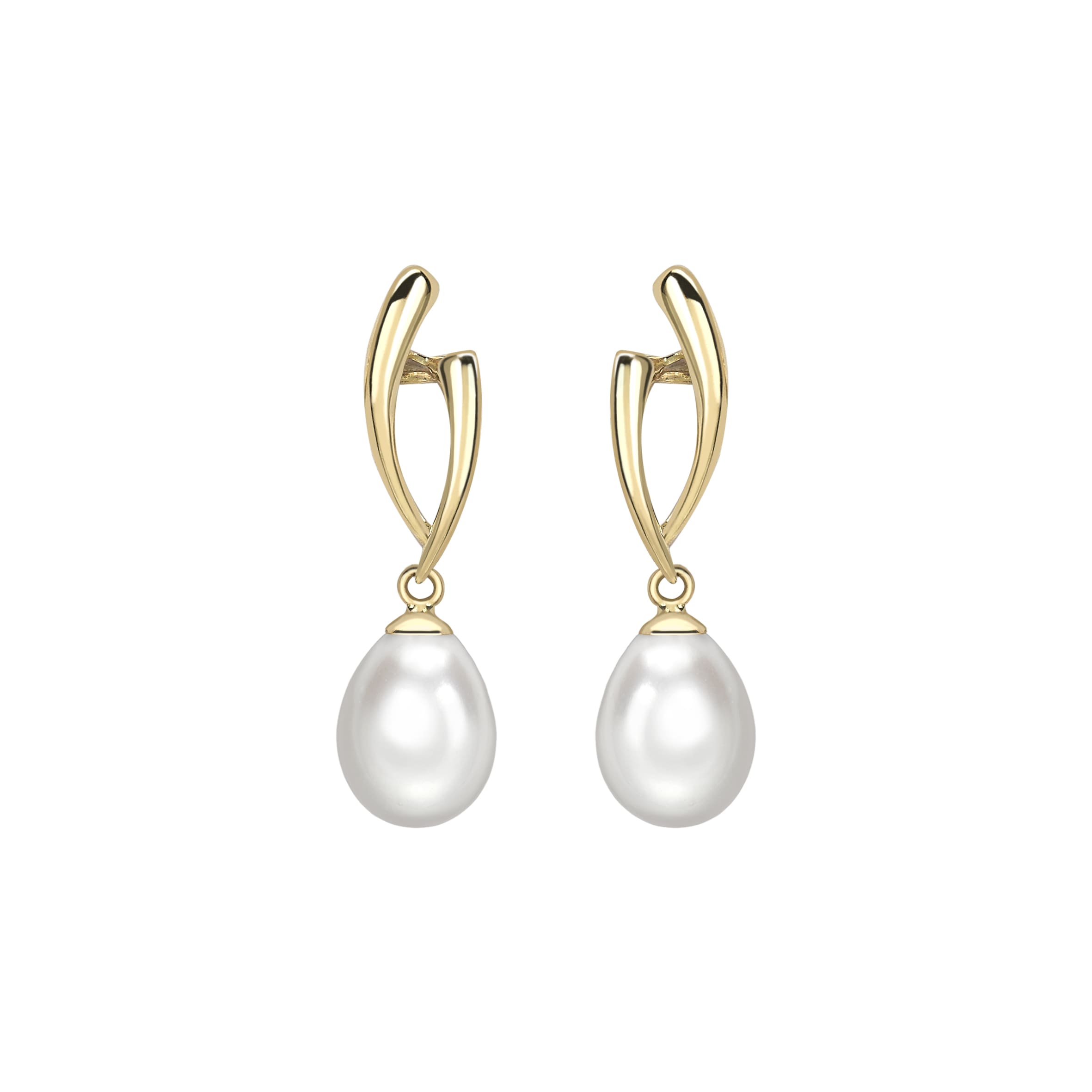 Modern drop earrings with oval, high lustre white cultured pearls and attractively shaped yellow gold fittings.