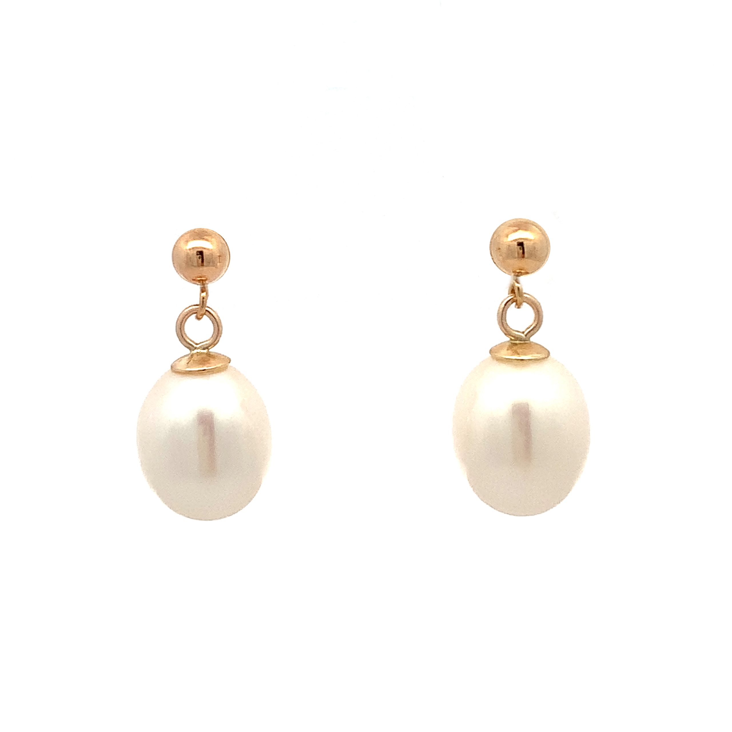 Classic drop earrings with oval high lustre white cultured pearls on stud fittings.