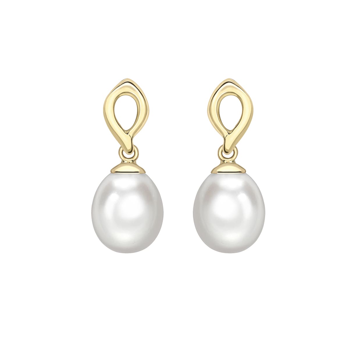 Modern drop earrings with oval, high lustre white cultured pearls and yellow gold fittings.