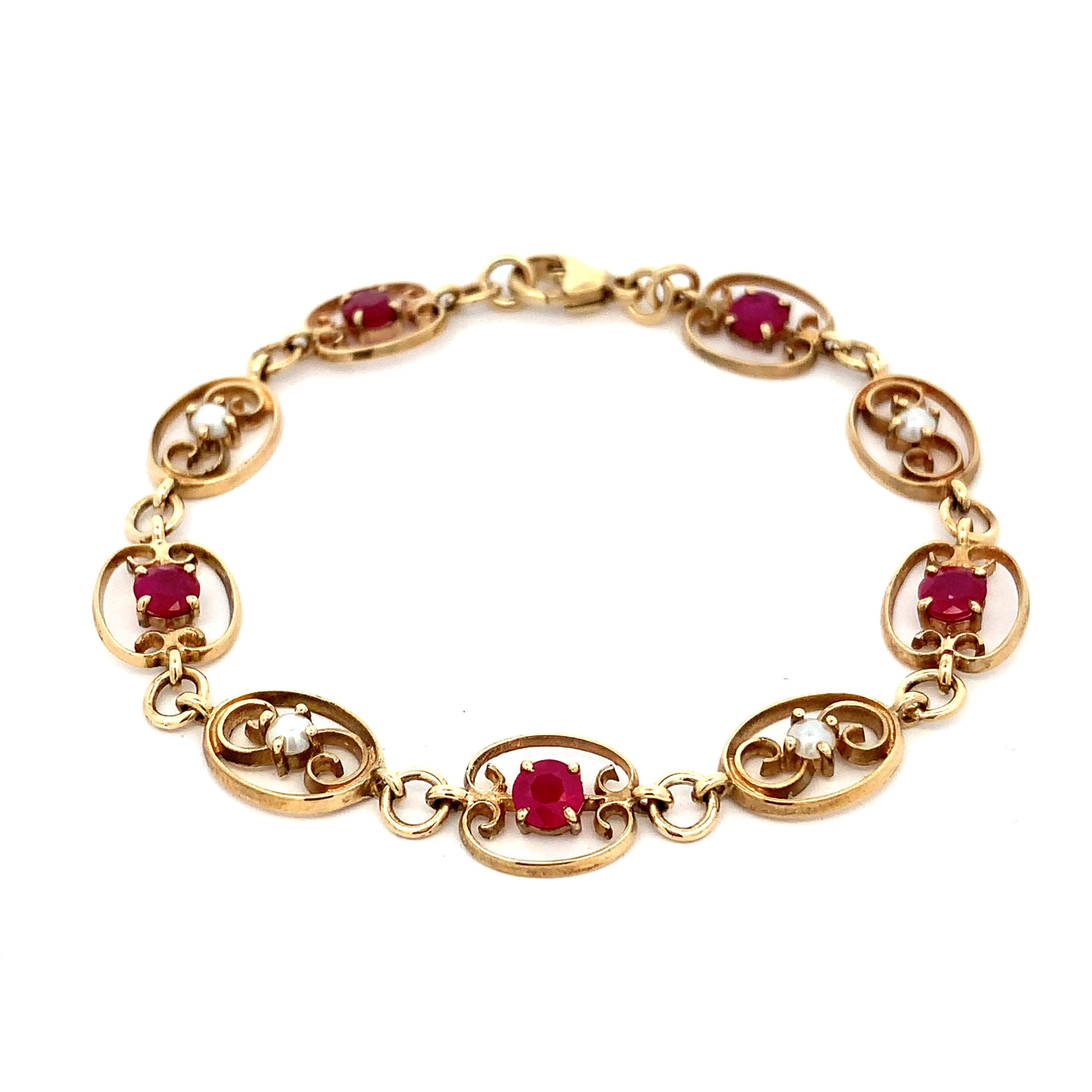 A pretty gold dress bracelet claw set with round cut faceted ruby and half pearls. In very good condition.
