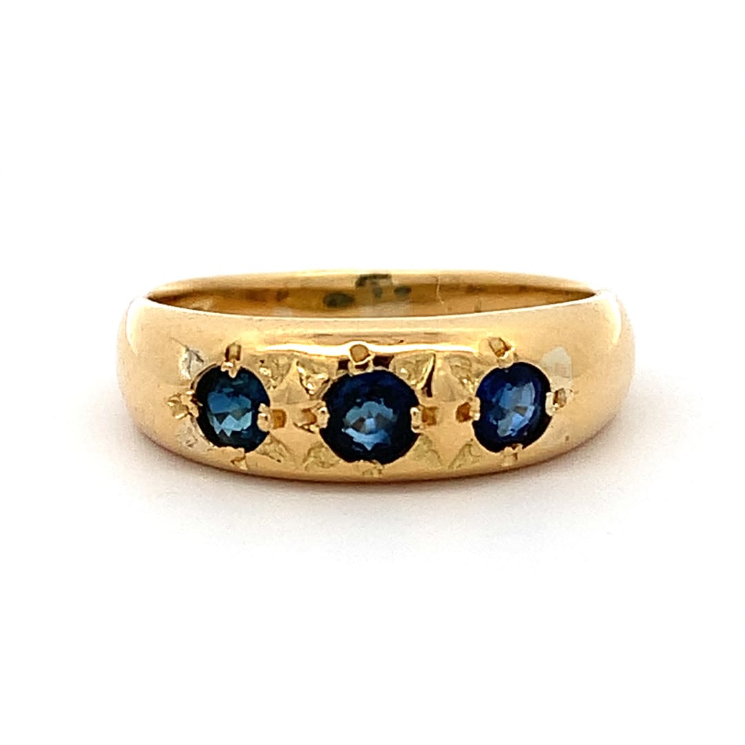 A smooth bombe style ring with three round cut blue sapphires in star settings.