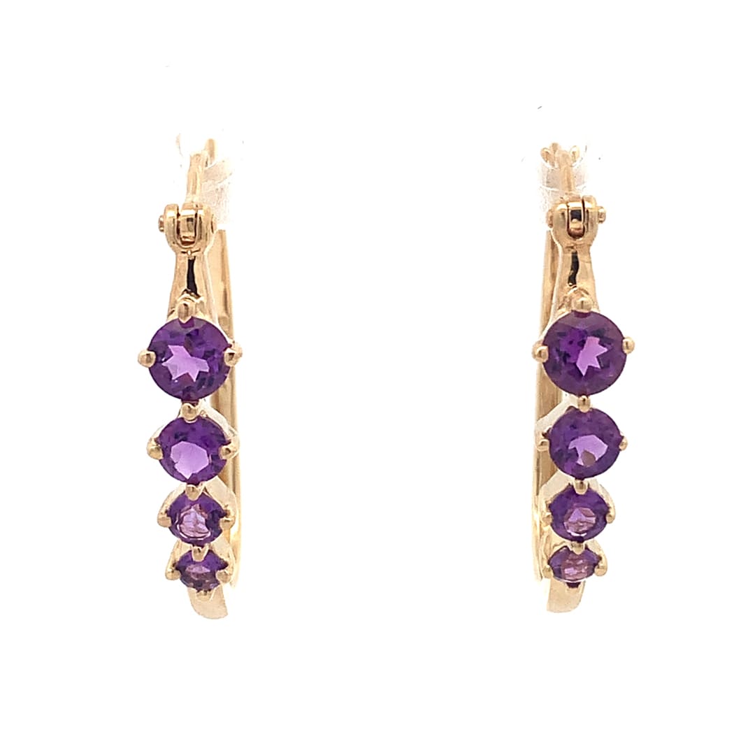 Pretty creole style hoops set with graduated amethyst. Metal: 9 Carat Yellow Gold Height: 23 mm As a preowned item these earrings have been professionally cleaned, checked and polished in our workshop. Gift Boxed