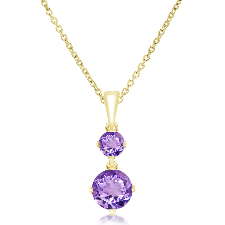 Sparkling round cut amethyst claw set in beautifully simple pendant on a trace chain. 925 sterling silver with yellow gold plating. Pendant Height: 24 mm Chain: Adjustable 17 – 18 inch trace chain with trigger clasp. Gift Boxed