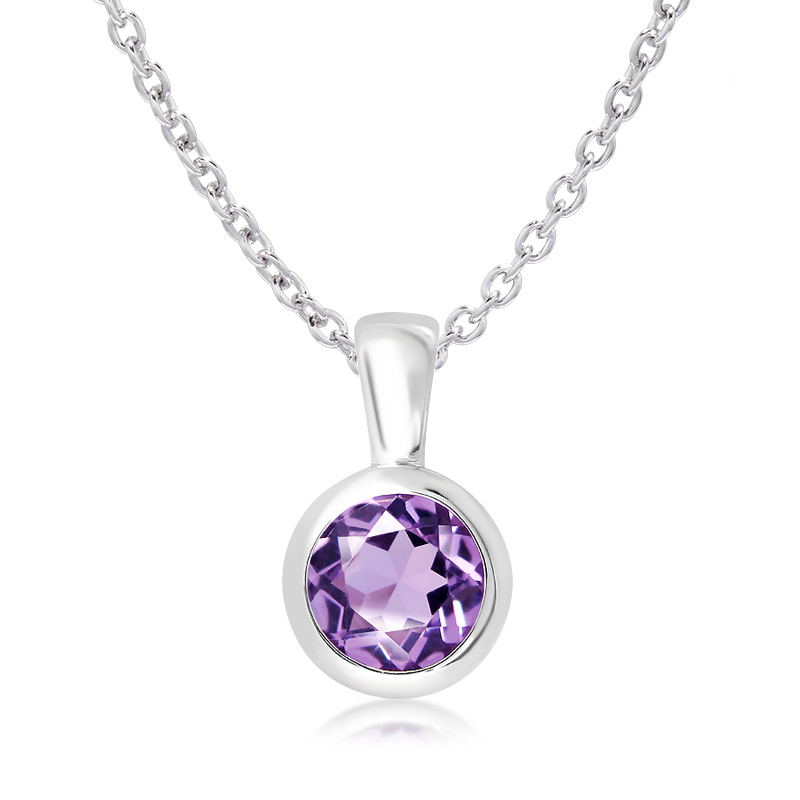 Sparkling round cut amethyst rub-over set in beautifully simple pendant on a trace chain. 925 sterling silver with rhodium plating. Pendant Width: 8.5 mm Chain: Adjustable 17 – 18 inch trace chain with trigger clasp. Gift Boxed