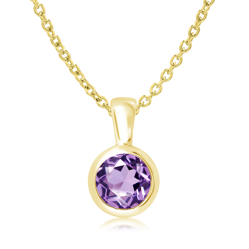 Sparkling round cut amethyst rub-over set in beautifully simple pendant on a trace chain. 925 sterling silver with yellow gold plating. Pendant Width: 11 mm Chain: Adjustable 17 – 18 inch trace chain with trigger clasp. Gift Boxed