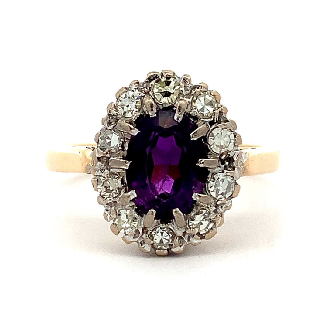 A beautiful gold cluster ring all claw set with richly coloured oval cut amethyst and round cut diamond. Metal: 18 Carat Yellow Gold Date: Circa 1950’s Cluster Dimensions: 11 x 13.5 mm Current Finger Size: O As a pre owned item, this ring has been examined and professionally cleaned and polished in our workshop. Gift …