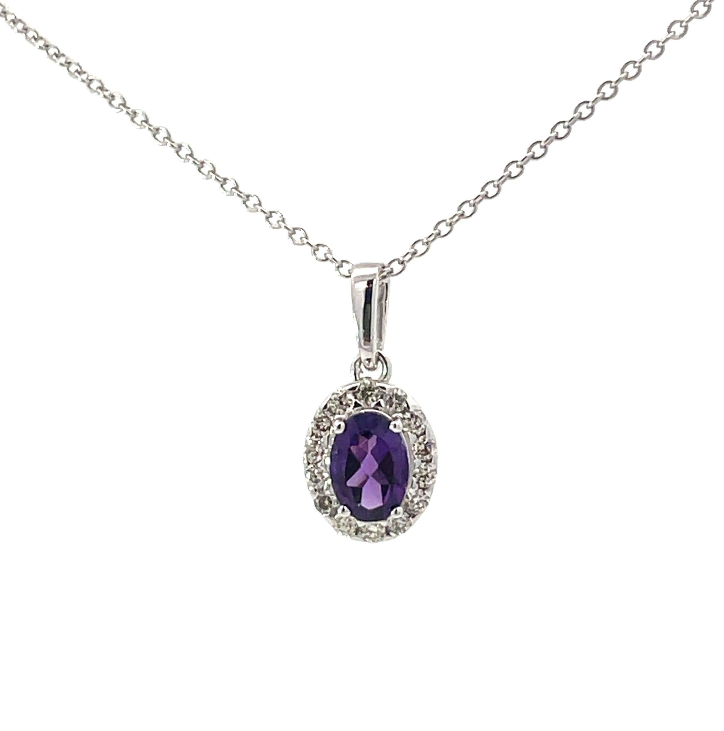 Vivid oval cut amethyst framed by round brilliant cut diamond. This claw set pendant comes on an adjustable trace link chain. Metal: 9ct White Gold Pendant Width: 8.6 mm Chain: Adjustable – 18 or 20 inches. Gift Boxed
