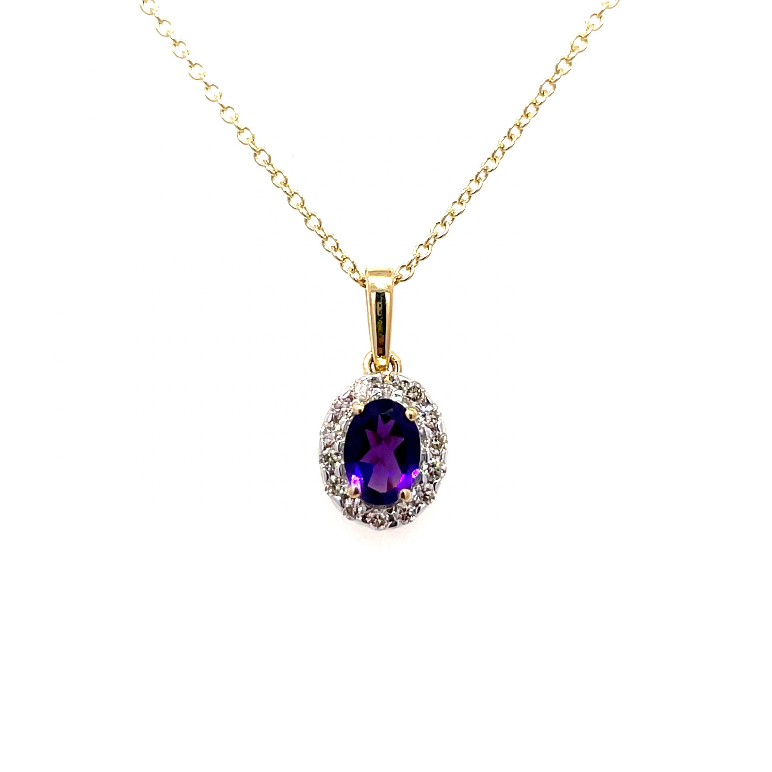 Vivid oval cut amethyst framed by round brilliant cut diamond. This claw set pendant comes on an adjustable trace link chain. Metal: 9ct Yellow Gold Pendant Width: 8.5 mm Chain: Adjustable – 18 or 20 inches. Gift Boxed