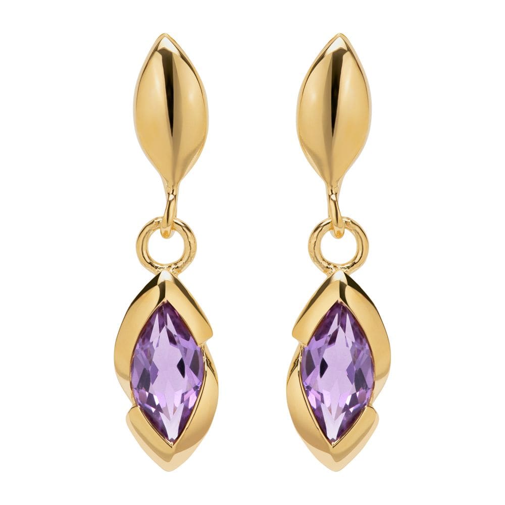 Sparkling marquise cut amethyst in a pretty articulated drop earring. Yellow gold plated 925 sterling silver. Height: 24 mm Posts and scroll back fittings. Gift Boxed