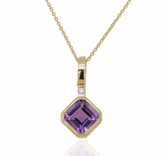 Vivid square cut amethyst in a smooth rub-over setting accented by a brilliant cut diamond. This pendant comes on a sparkly trace link chain. Metal: 9ct Yellow Gold Pendant Width: 10 mm Chain: Adjustable – 18 inches. Gift Boxed