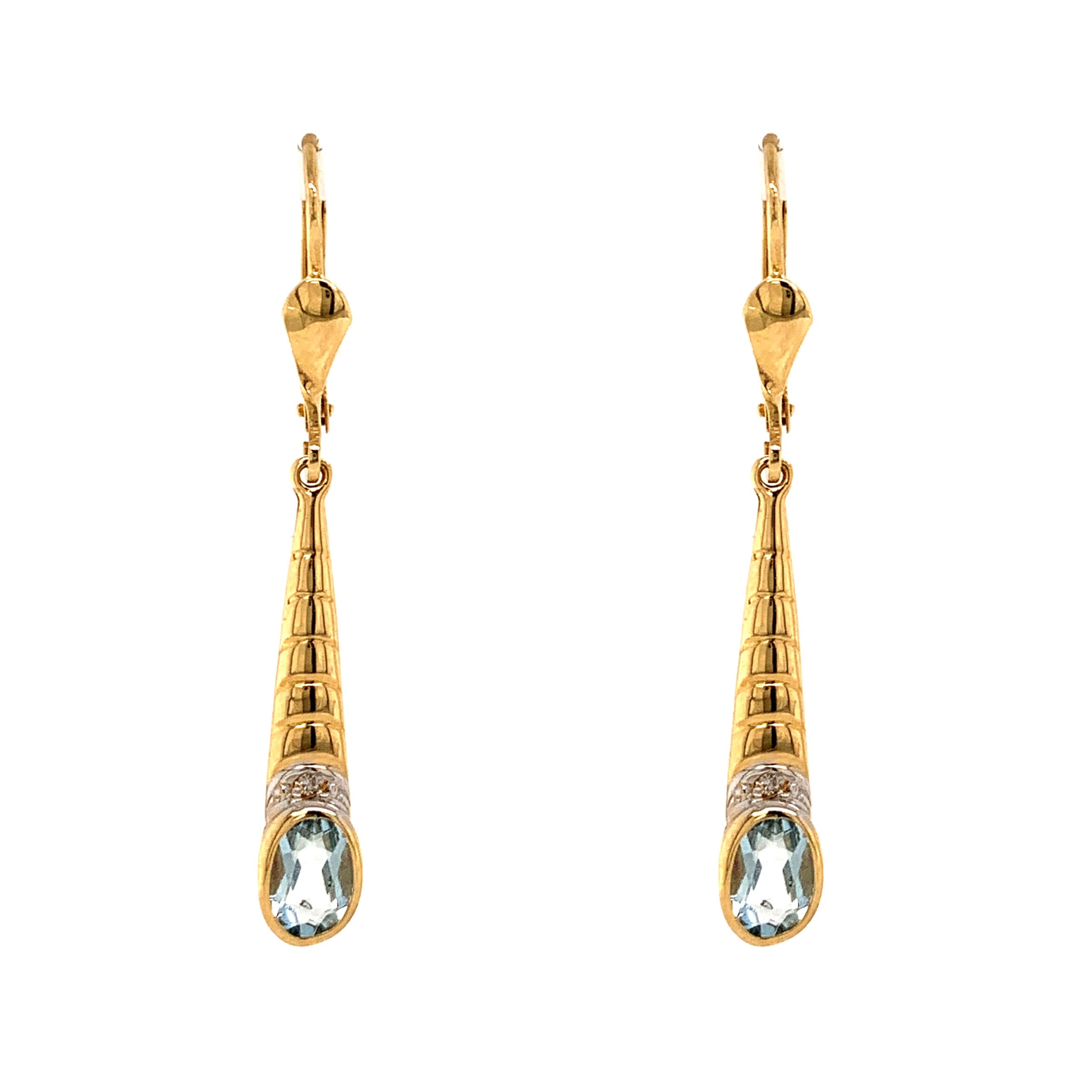 Elegant gold drop earrings rub-over set with oval cut aquamarine. Metal: 18 Carat Yellow Gold Date: Modern Total Length: 37 mm Fittings: Continental Hooks. As a preowned item, these earrings have been examined and professionally cleaned and polished in our workshop. Gift Boxed