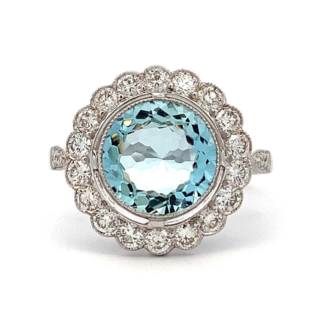 A gorgeous hand made halo style ring with a round cut Aquamarine encircled with bright round cut Diamonds, all in rub-over settings with a millegrain edge for a vintage feel. With Diamond pave work on the shoulders. This ring is a one-off handmade piece. Metal: 18 Carat White Gold Aquamarine Weight: 2.25 Carat Total Diamond …