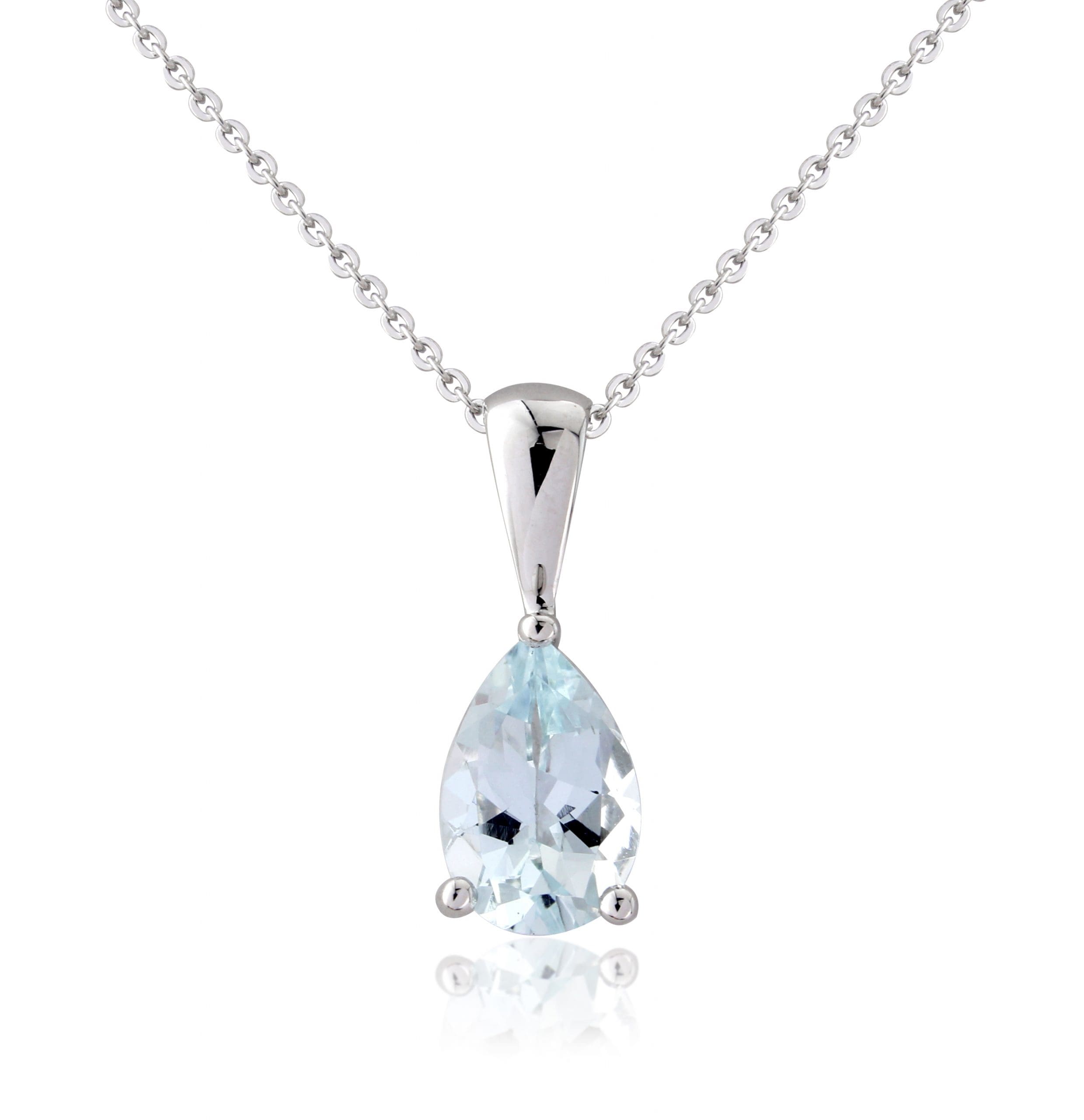A gold pendant and chain with a pear cut aquamarine in a claw setting. Metal: 9ct White Gold Pendant Width: 6 mm Chain: Adjustable – 16 or 18 Inches Gift Boxed