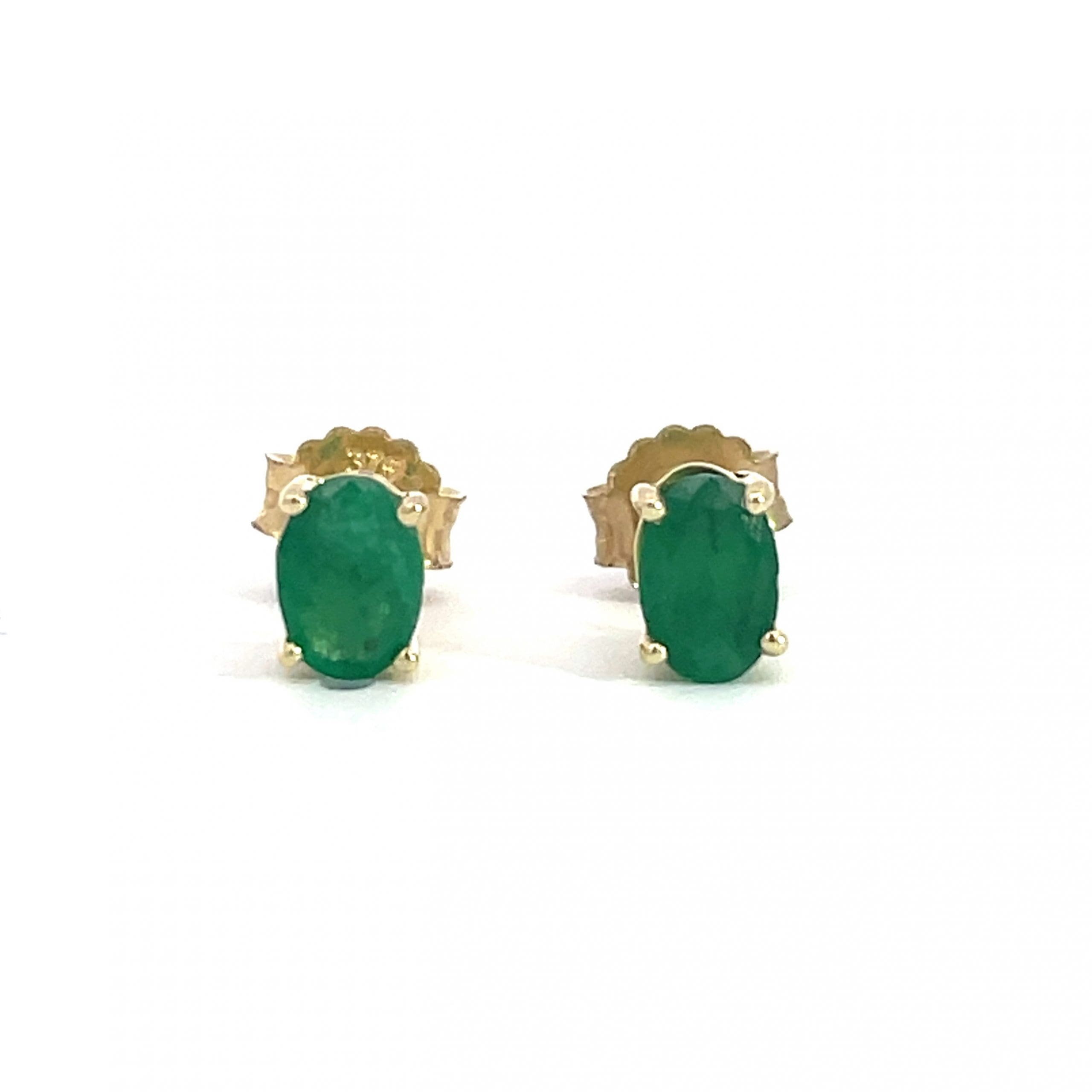 A classic pair of 9 carat gold stud earrings set with oval faceted emerald. With basket settings and double click secure posts and scroll backs. Metal: 9 Carat Yellow Emerald Dimensions: 6 x 4 mm Gift Boxed