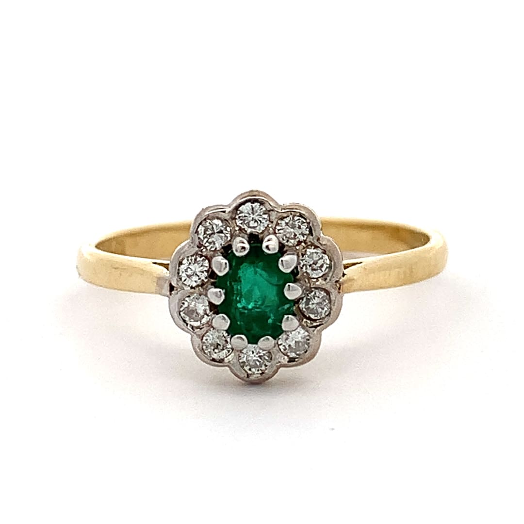 A pretty white gold diamond set flower topped with round cut emerald. On a yellow gold ring shank. Metal: 18 Carat Yellow Gold Date: London 1985 Cluster Dimensions: 9.4 x 8.1 mm Current Finger Size: O This item has been thoroughly checked, cleaned and polished by our workshop. Gift Boxed