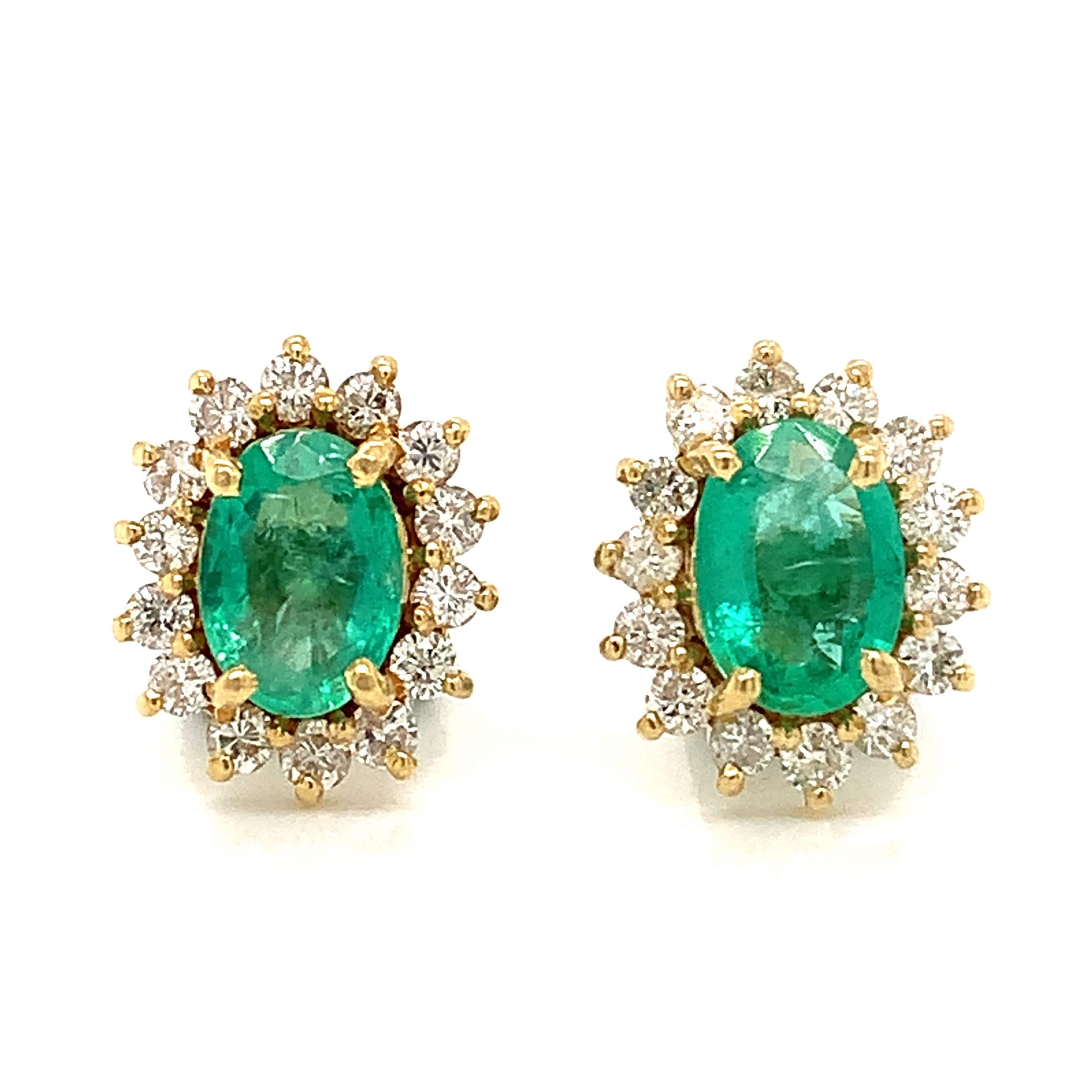 Lovely fresh green emeralds framed with small round cut Diamonds, all claw set. Metal: 18 Carat Yellow Gold Hallmark: London 1987 Assessed Total Emerald Weight: 0.92 Carat Stud Dimensions: 11 x 9 mm Fittings: Posts and Scroll Backs. As a pre-owned item, these earrings have been examined and professionally cleaned and polished in our workshop. [...]